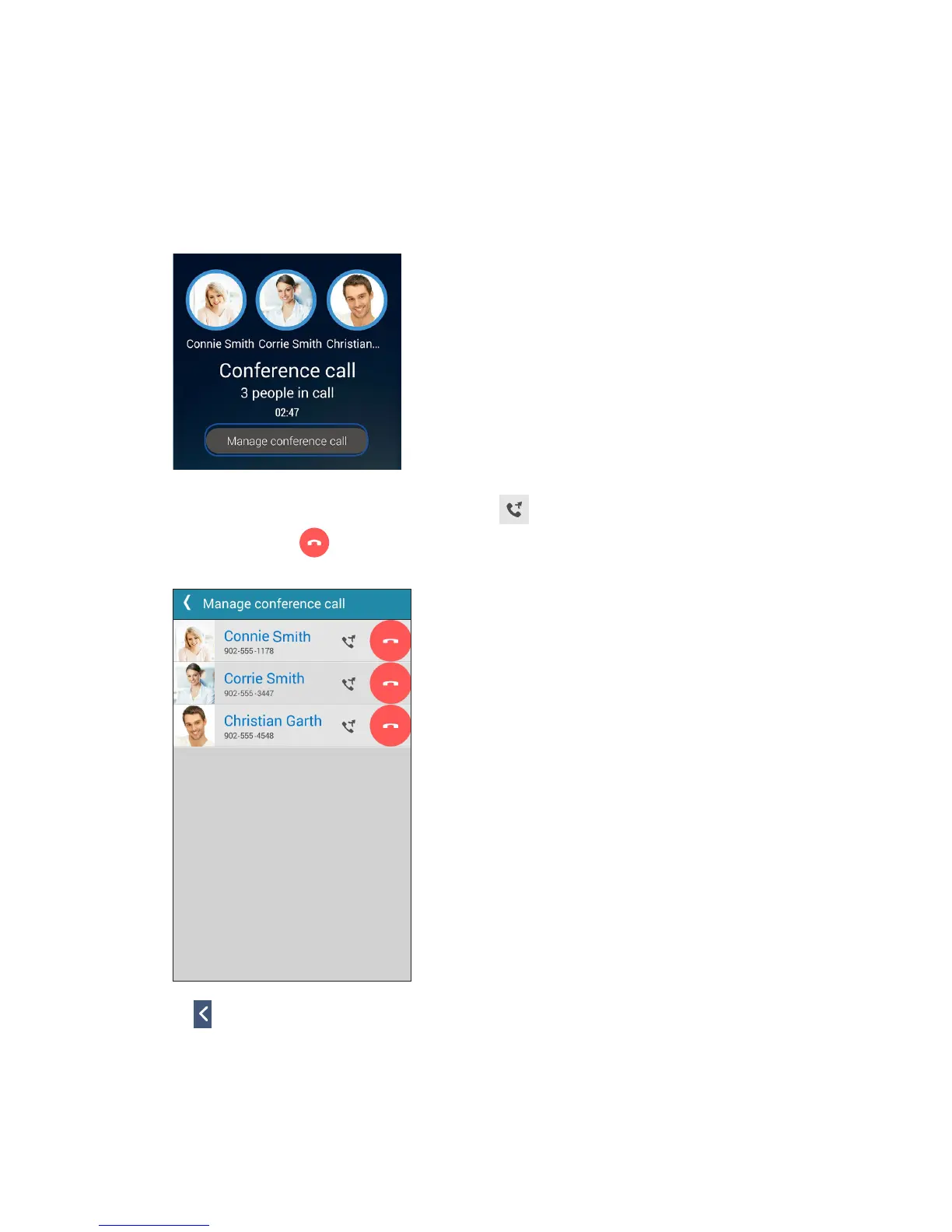 1. From the Conference call screen, tap Manage conference call to open a list of contacts in the