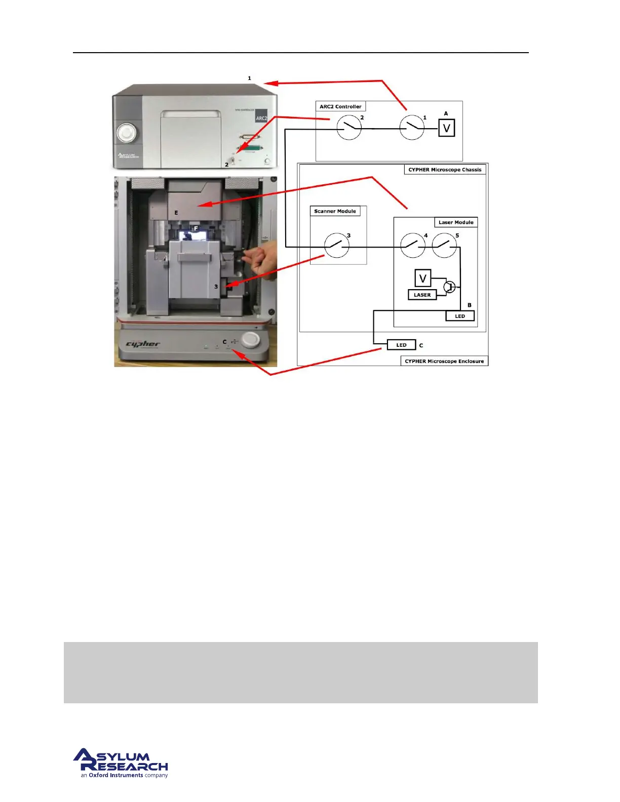Figure 20.5.: Cypher and ARC2 laser safety interlock system. (A) Laser Voltage Source. (1) Back panel