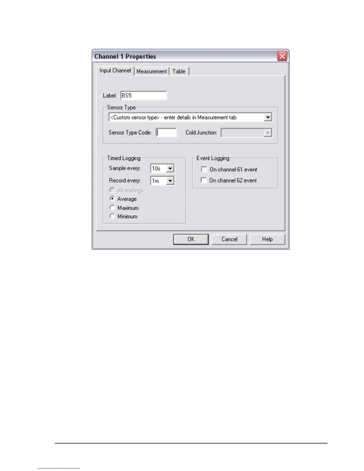 Figure 9. Channel Set-up for logging every 10s and recording every 1m