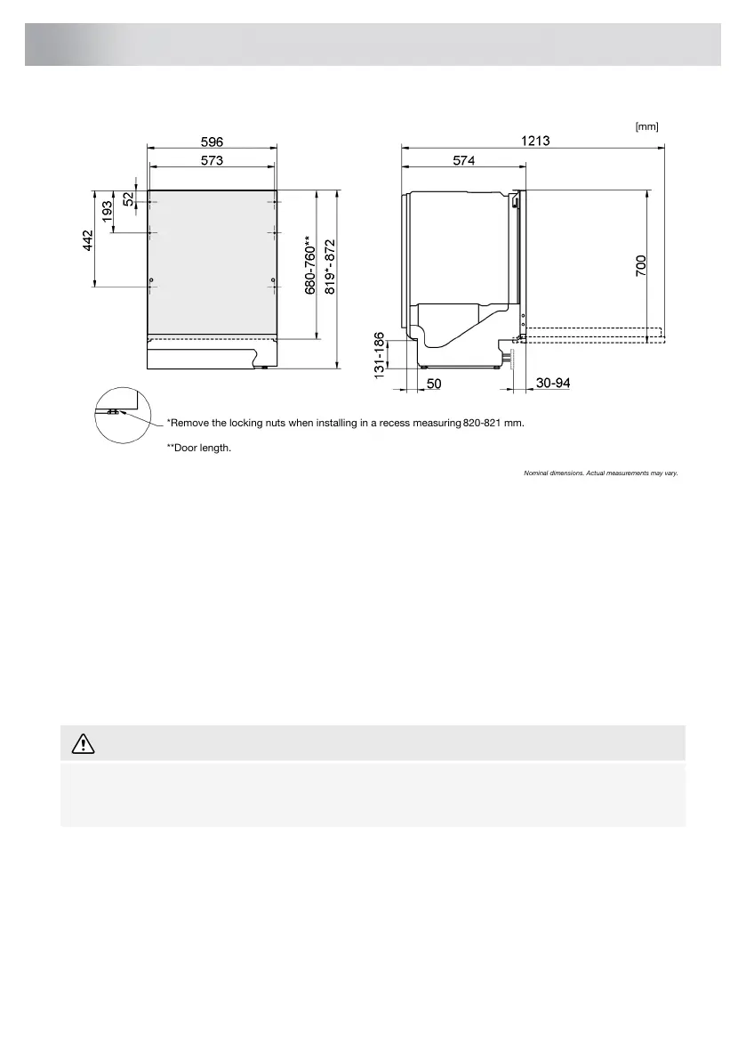 *Remove the locking nuts when installing in a recess measuring 820-821 mm.