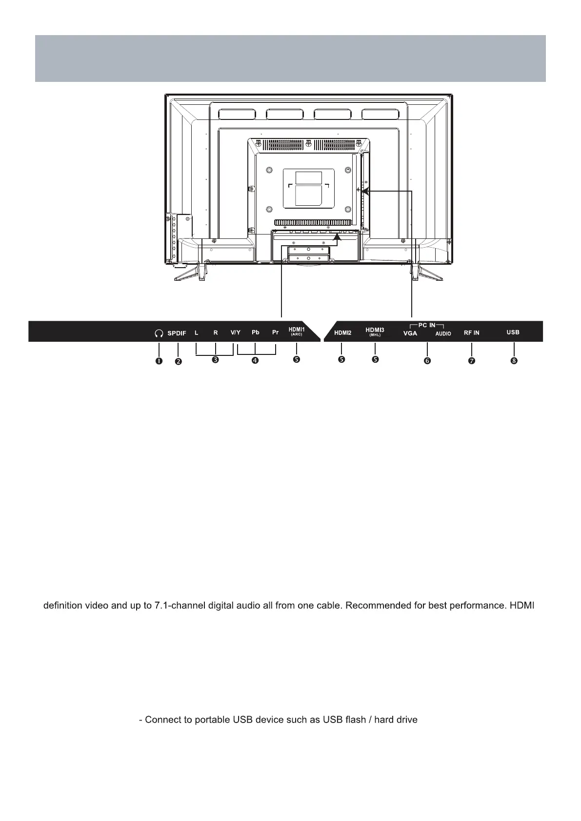 6. PC IN - VGA Input - Connect an optional VGA cable (not included) from your personal computer.