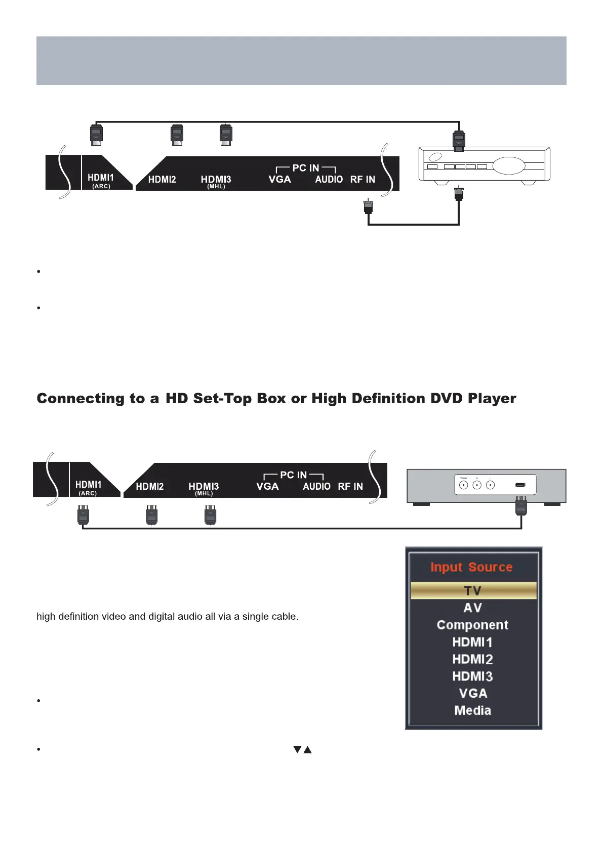 There are three (3) HDMI inputs available for use with HD set top boxes,