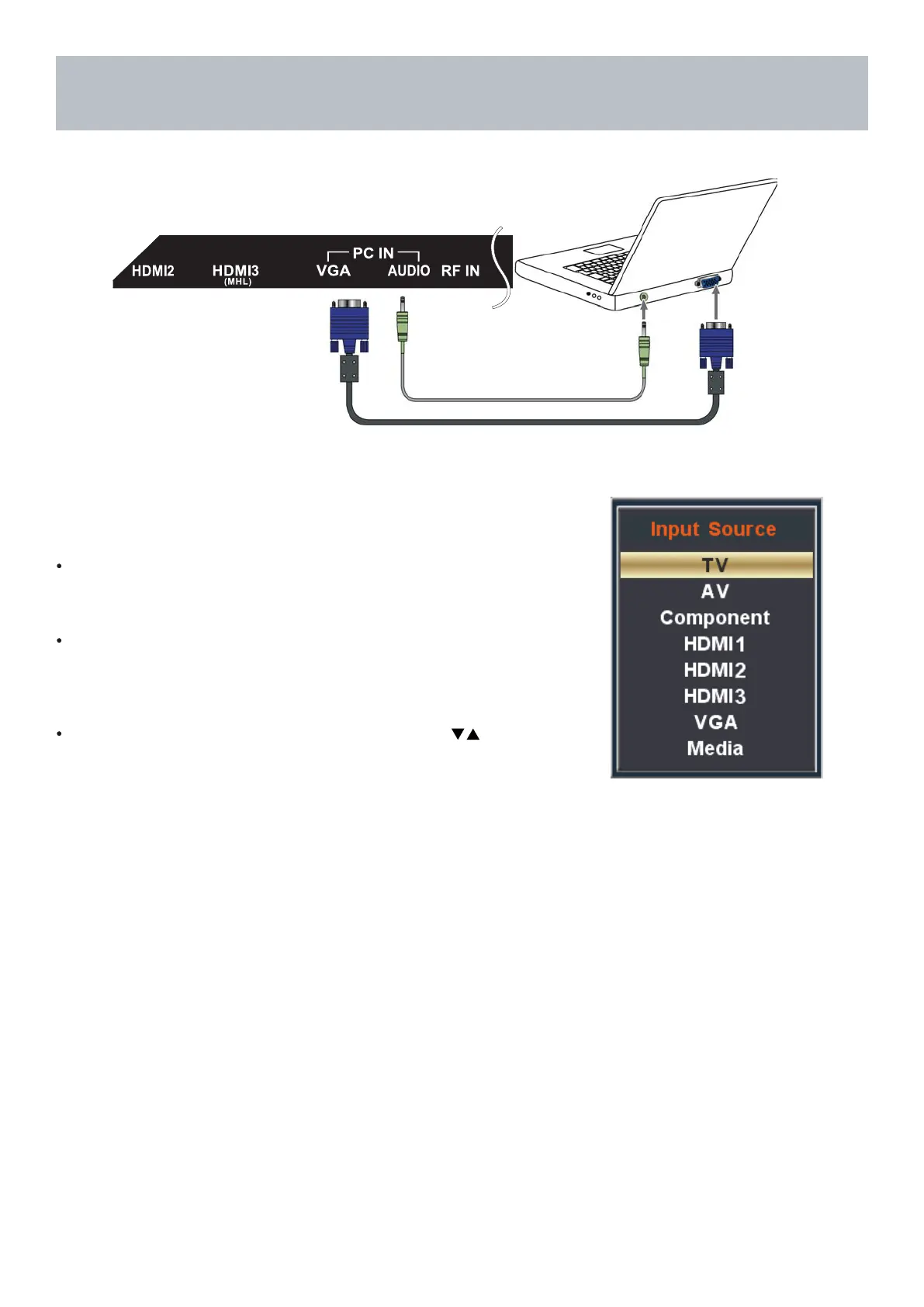 your PC to the VGA input on the TV’s panel.
