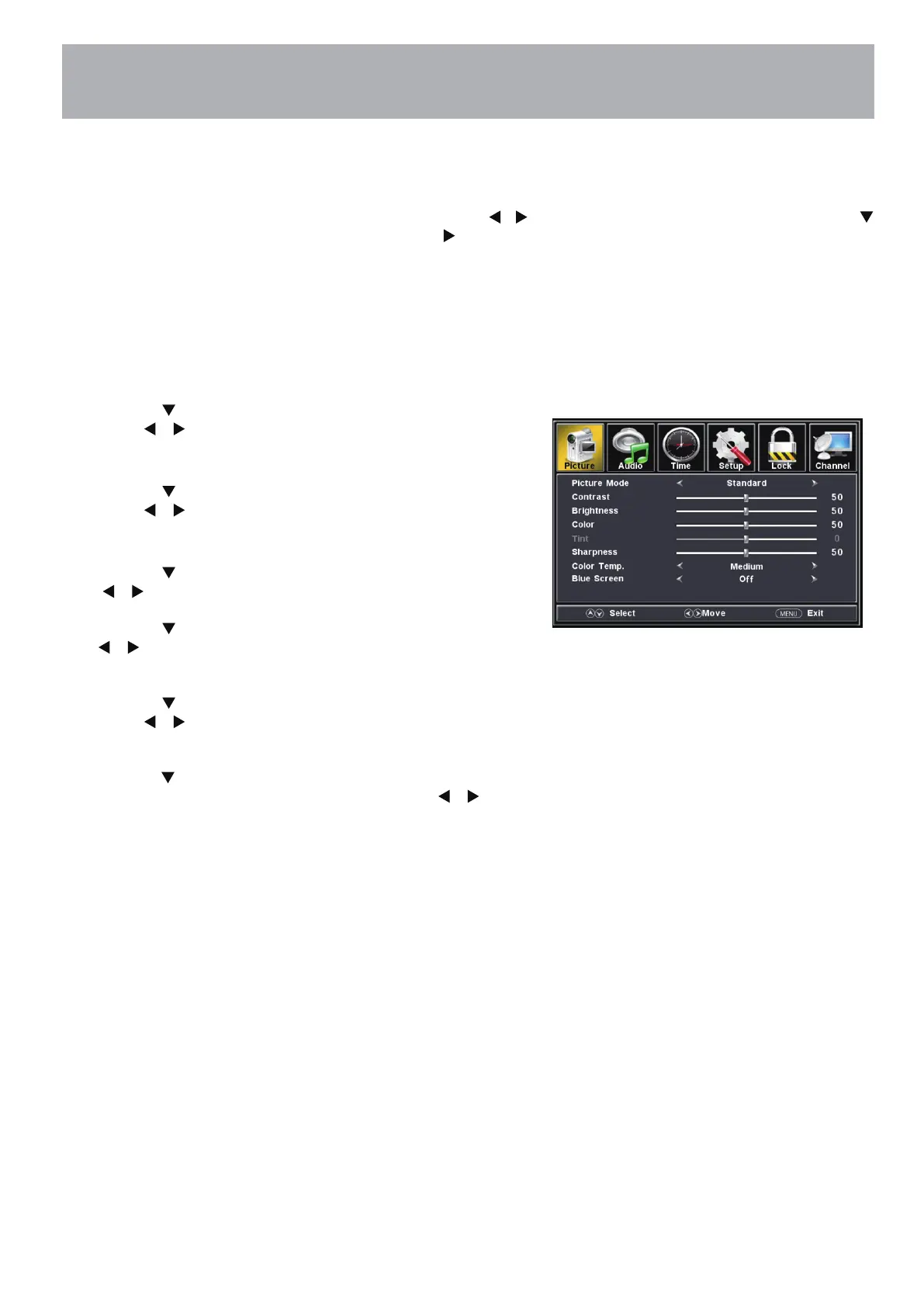 Note: When adjustments are completed, you may select another menu by pressing the Menu button.
