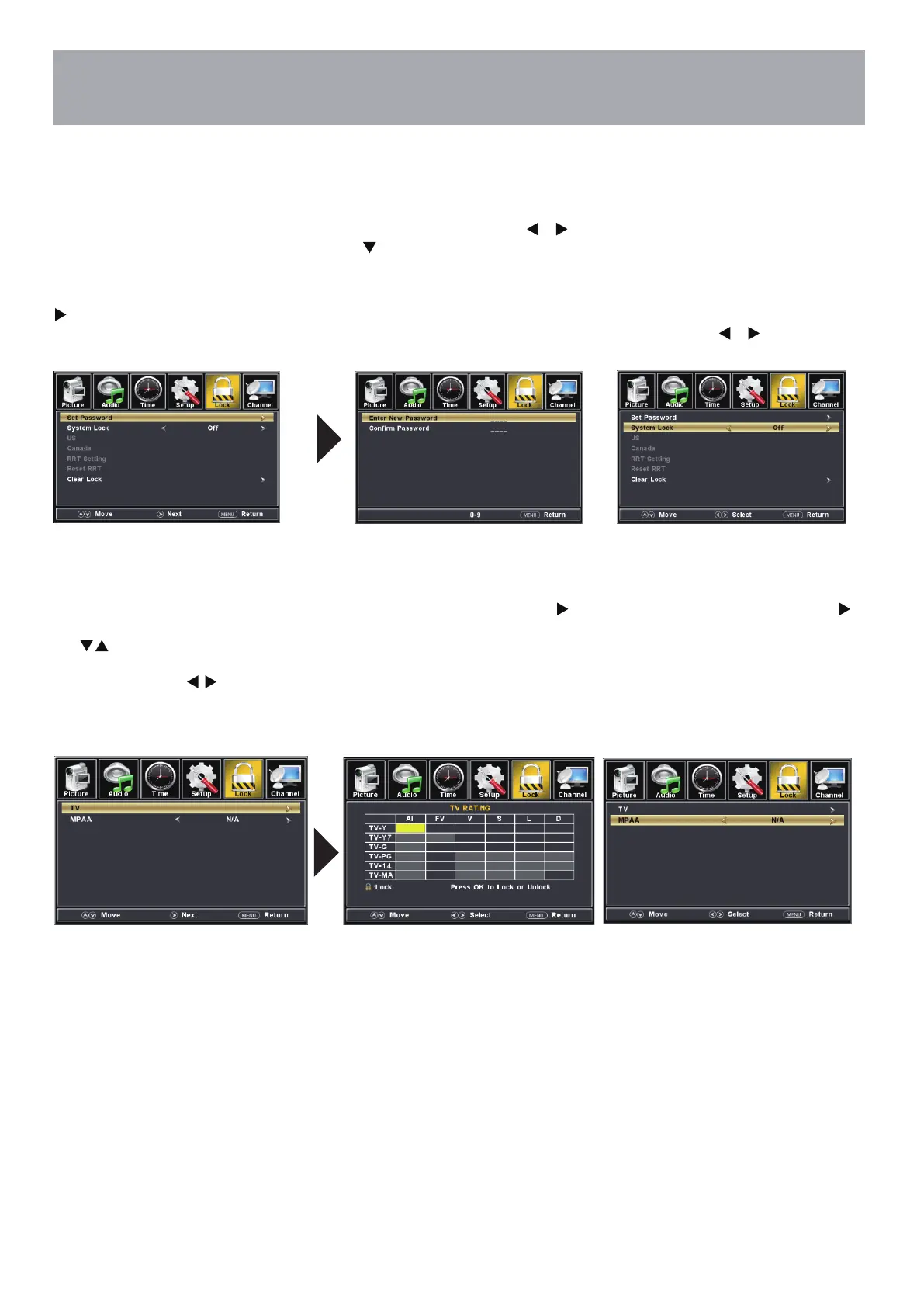 In the Lock menu, you may block television and movie programming based on TV ratings and Motion Picture Association