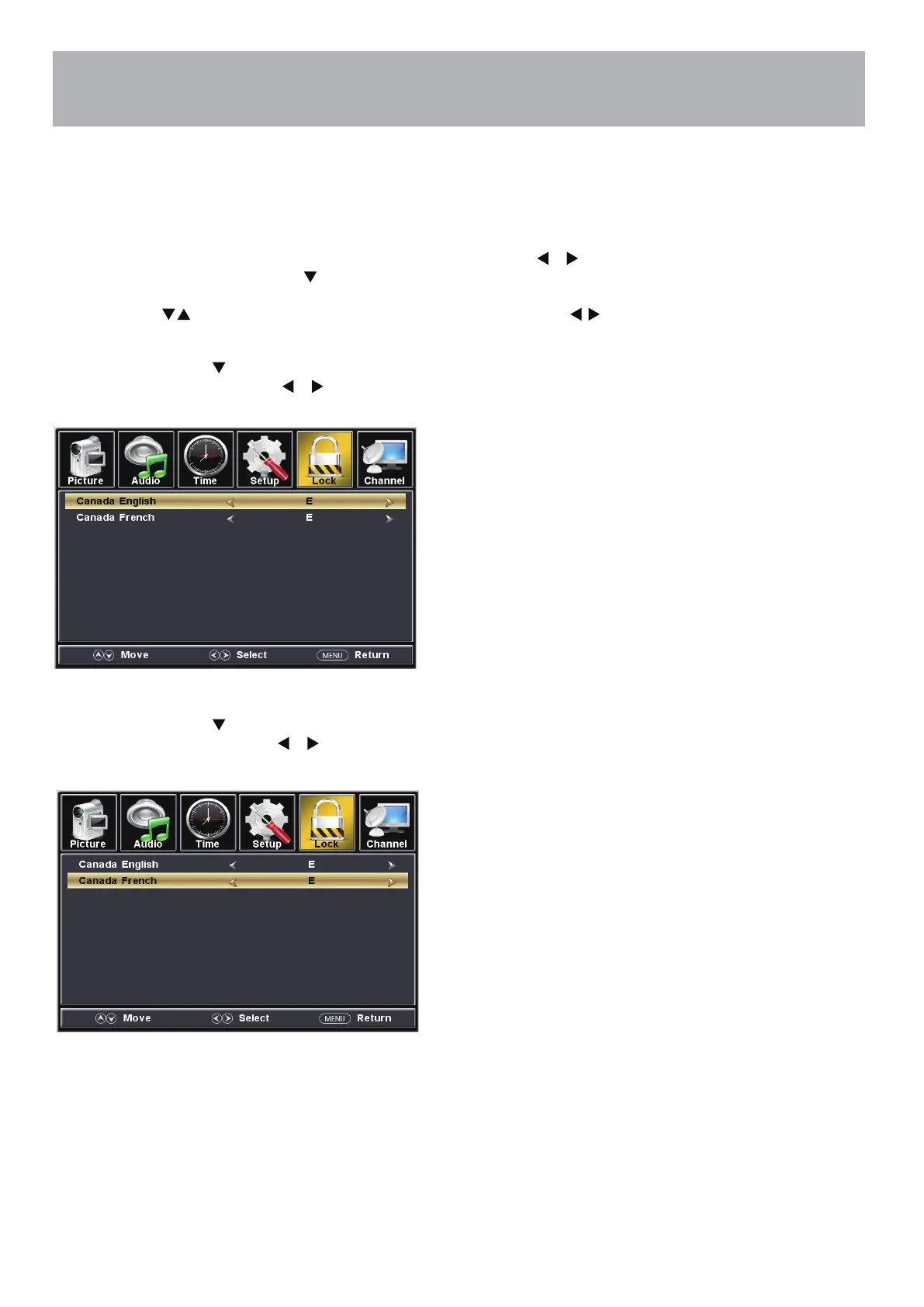 In the Lock menu, you may block television and movie programming based on Canadian TV and movie rating guidelines.