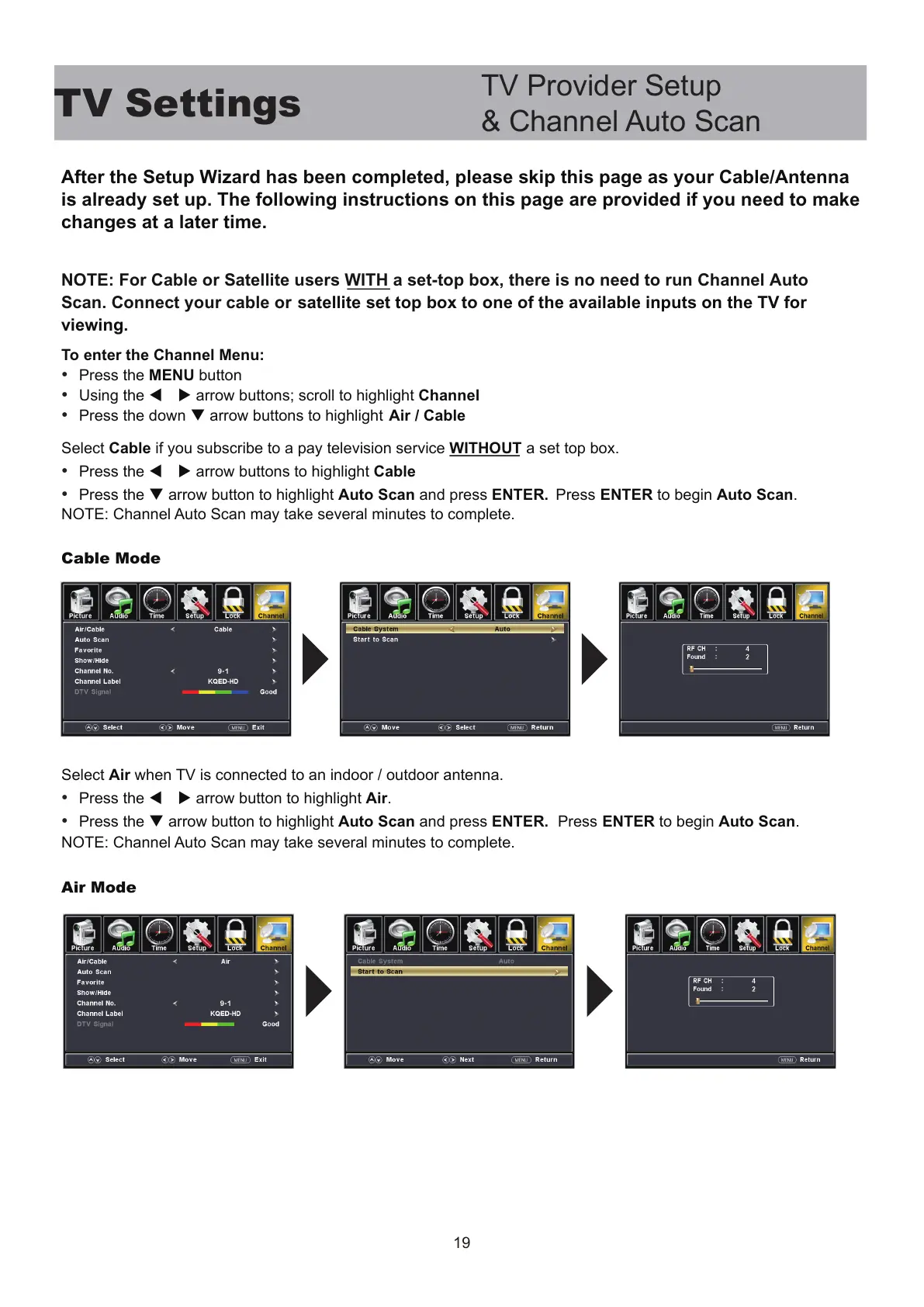 NOTE: For Cable or Satellite users WITH a set-top box, there is no need to run Channel Auto