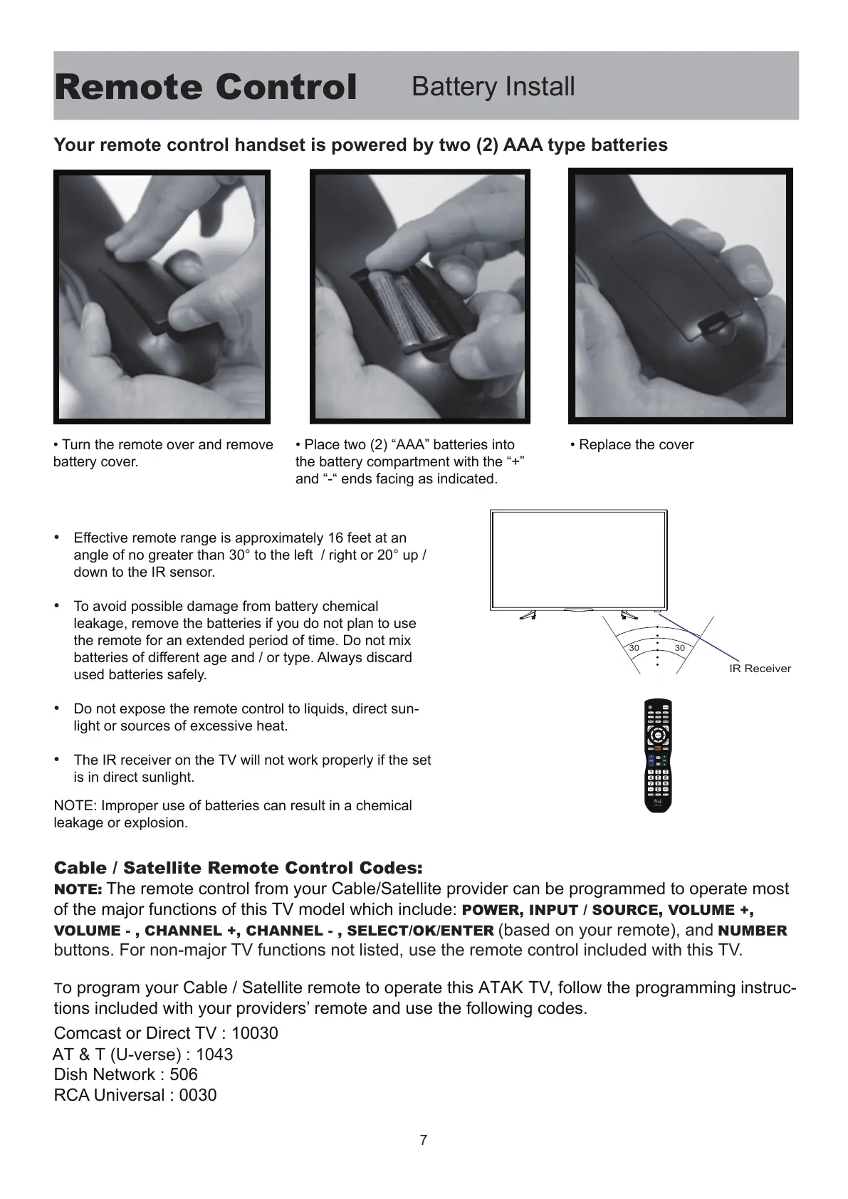 o program your Cable / Satellite remote to operate this ATAK TV, follow the programming instruc-