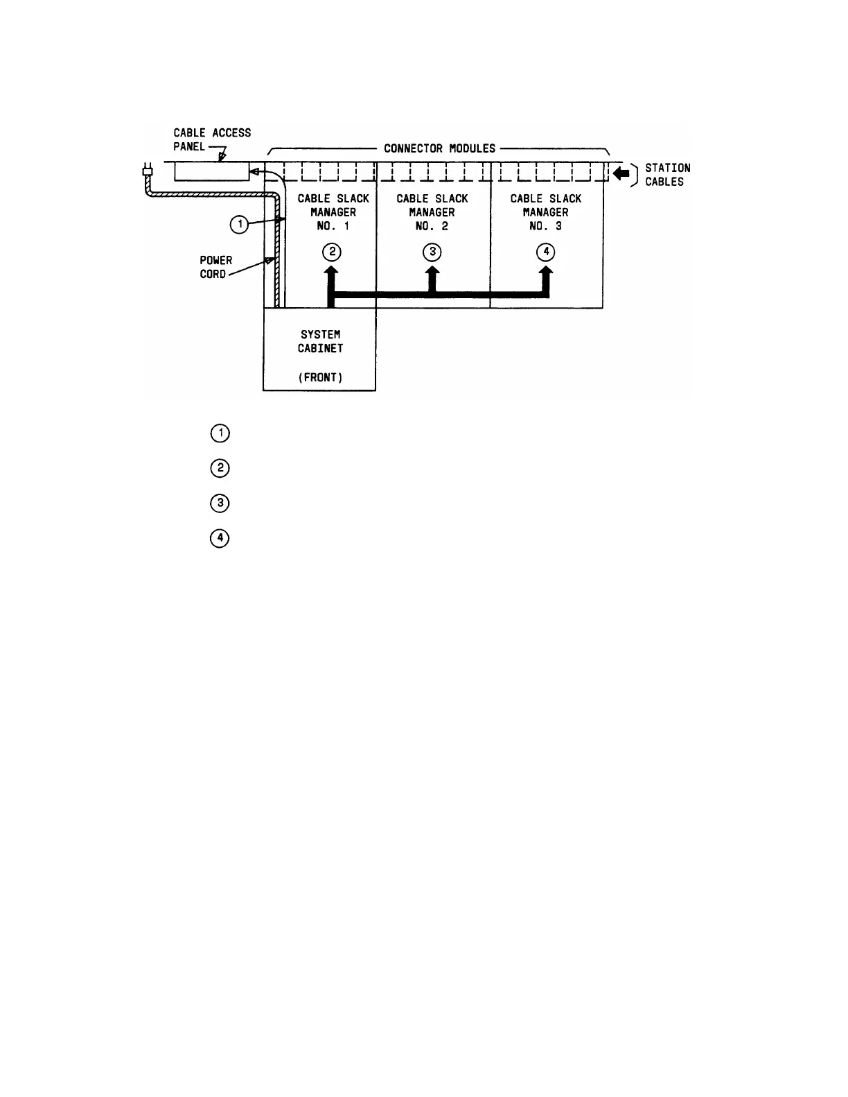 routed from the switch cabinet along the front trough of the cable slack manager to