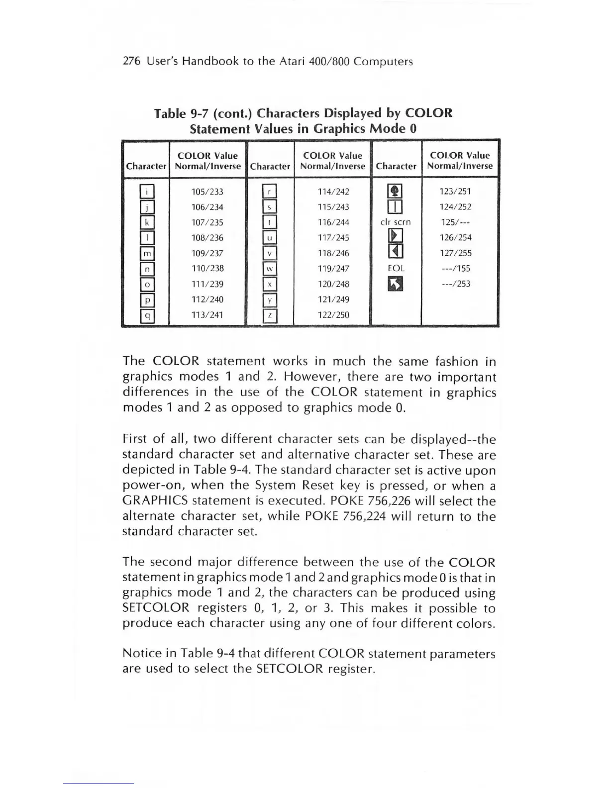 Table 9-7 (cont.) Characters Displayed by COLOR