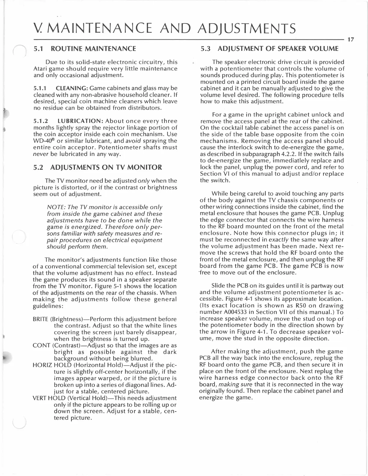 Atari Breakout - Maintenance and Adjustments; Routine Maintenance; Adjustments on TV Monitor; Adjustment of Speaker Volume