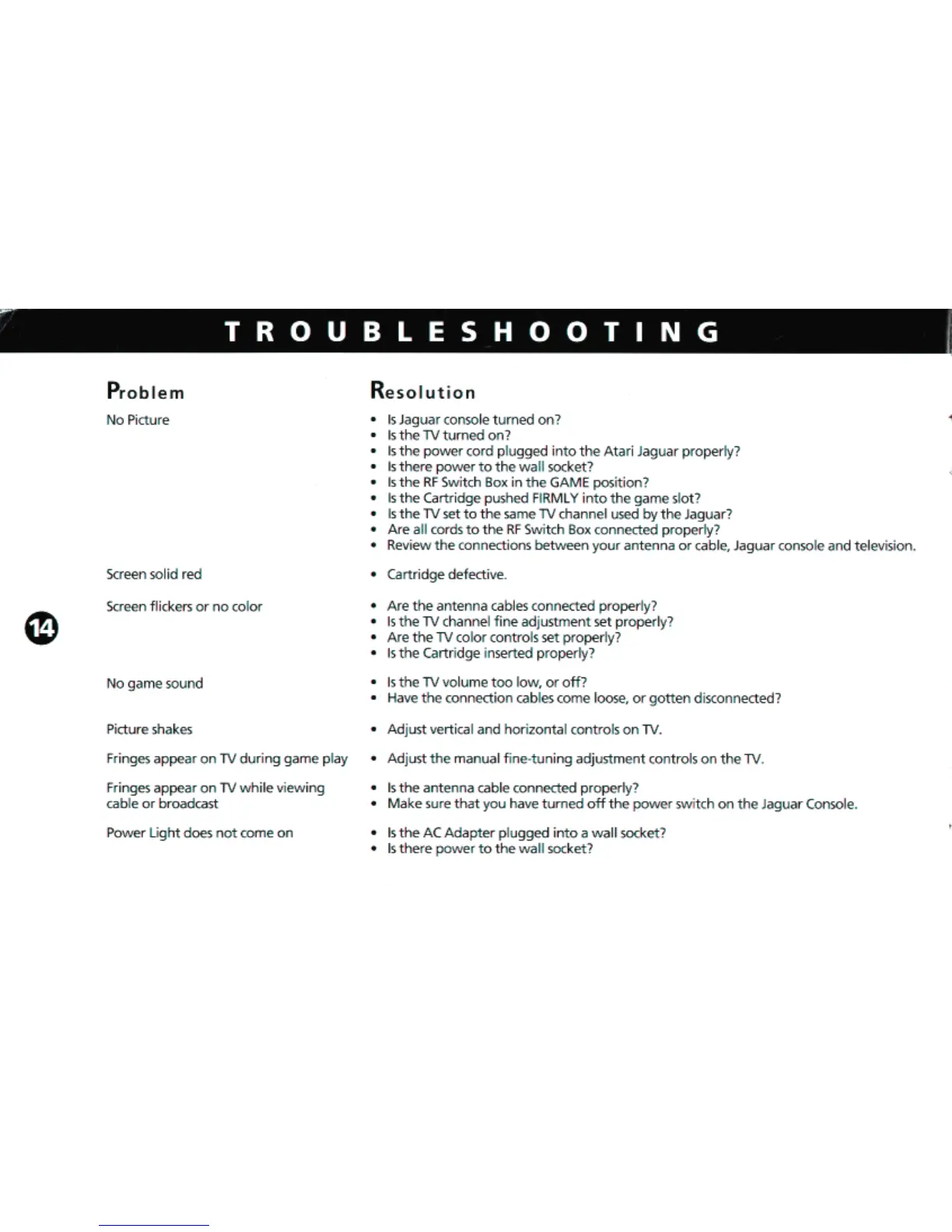 Atari Jaguar - Troubleshooting; No Picture; Screen solid red; Screen flickers or no color