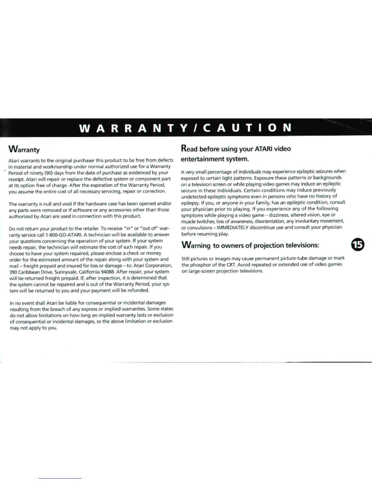 Atari Jaguar - Warranty;Caution; Warranty Information; Read Before Using Your Atari Video Entertainment System; Warning to Owners of Projection Televisions