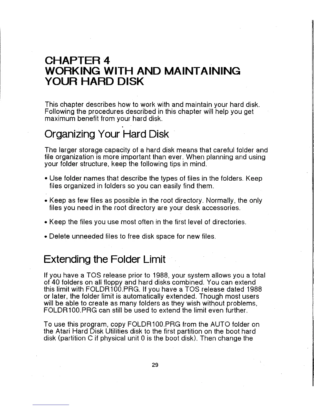 Atari Megafile - Working with and Maintaining Your Hard Disk; Organizing Your Hard Disk; Extending the Folder Limit