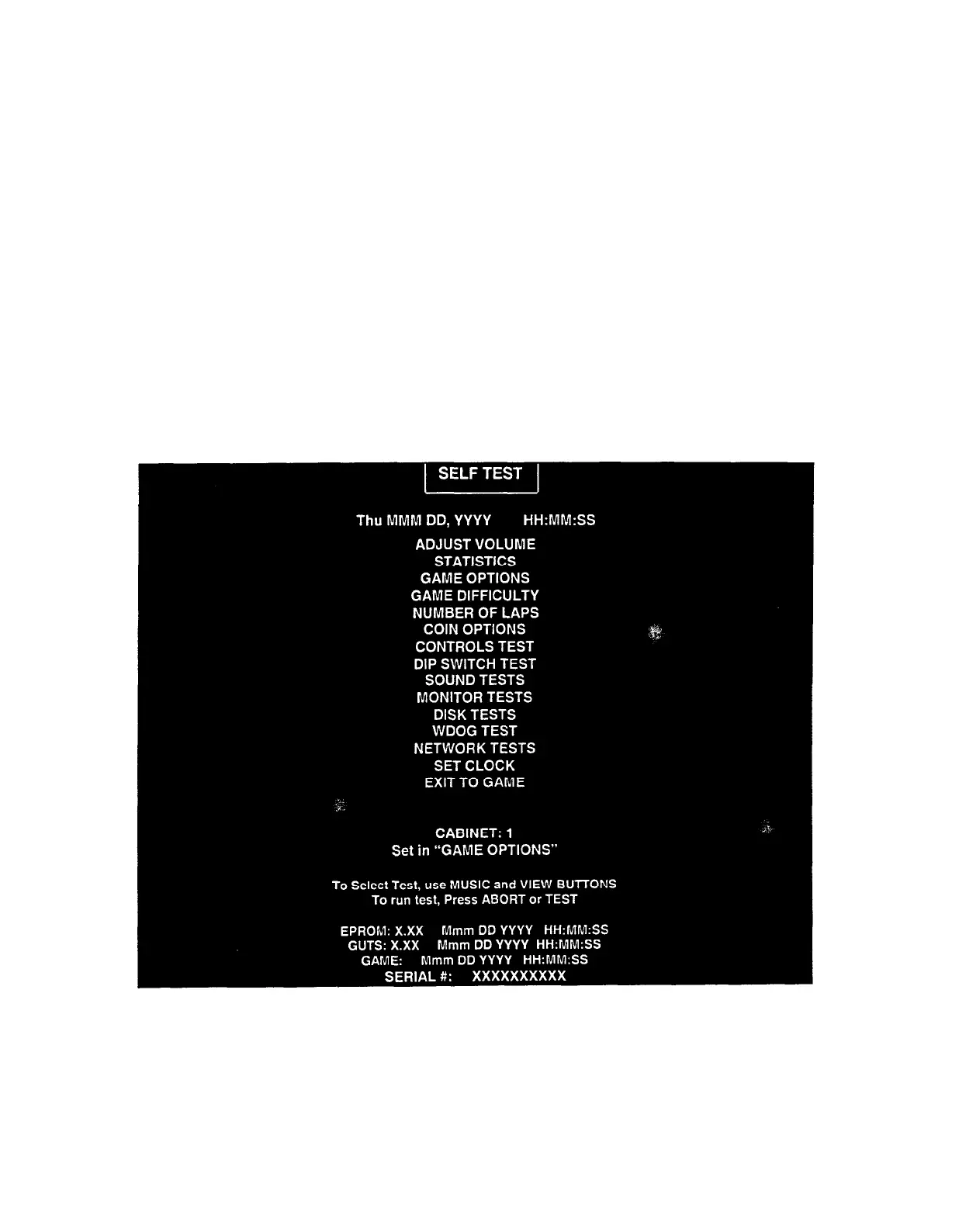 Game audits, adjustments and diagnostics are line items on the Self-Test Menu. Selecting an item opens