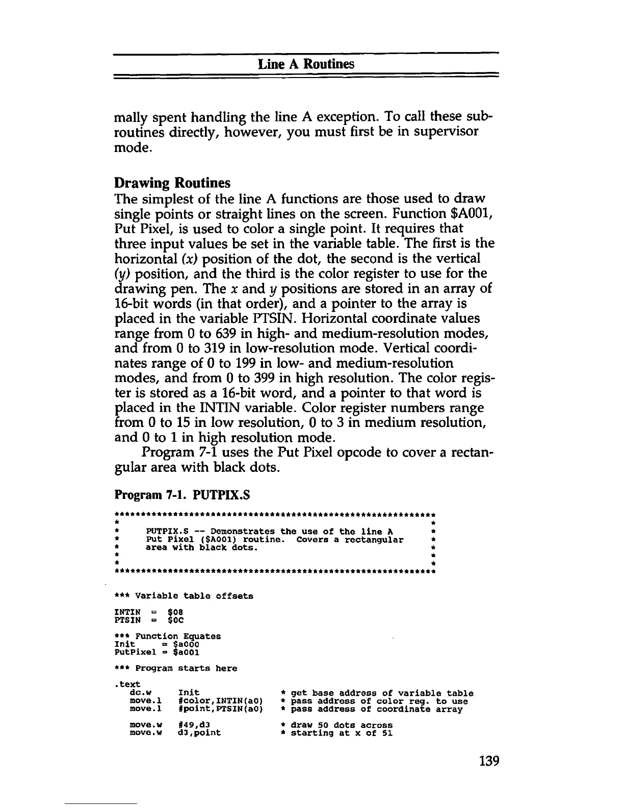 PUTPIX.S — Demonstrates the use of the line A