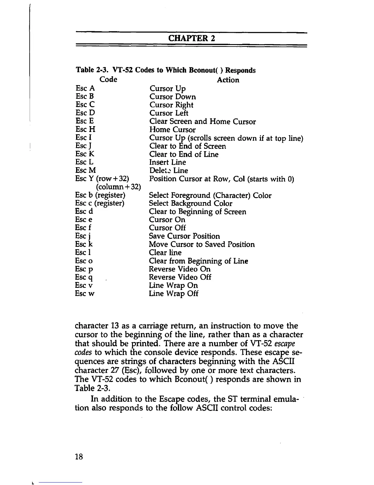 Table 2-3. VT-52 Codes to Which Bconout() Responds
