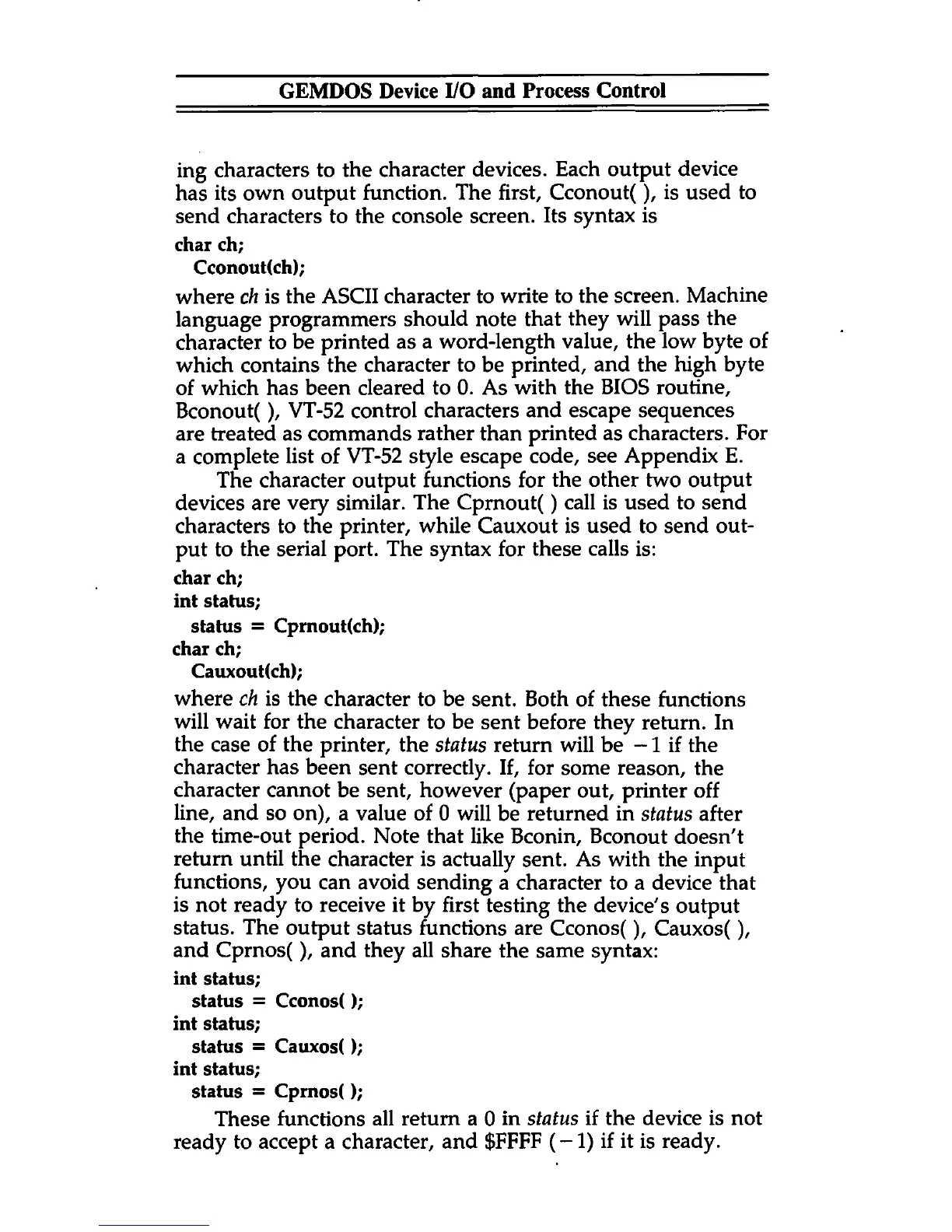 status. The output status functions are Cconos(), Cauxos(),
