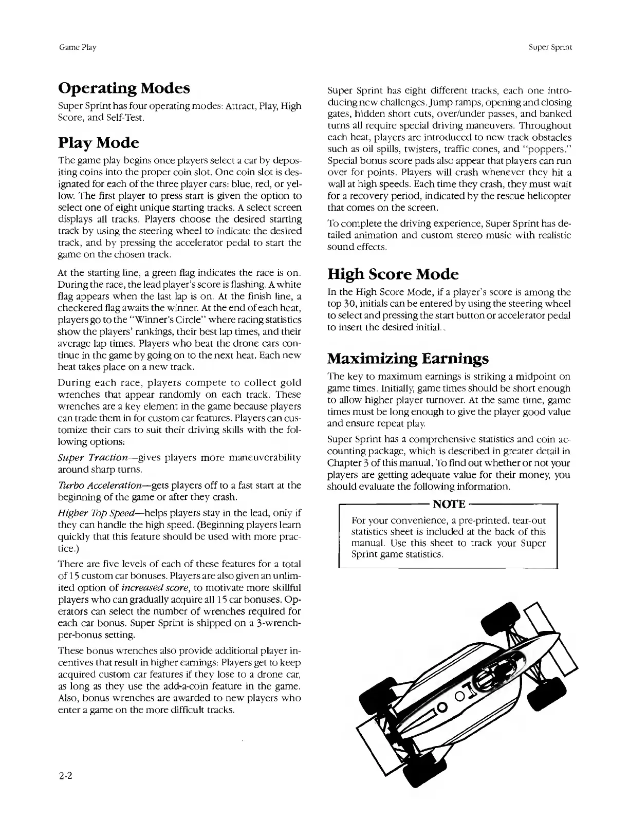 Atari SUPER SPRINT - Operating Modes; Play Mode; High Score Mode; Maximizing Earnings