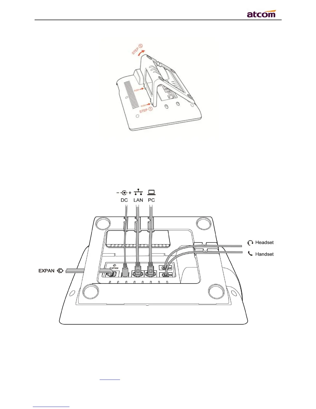 Plug in the power adapter, cable and handset or headset to the corresponding ports as below