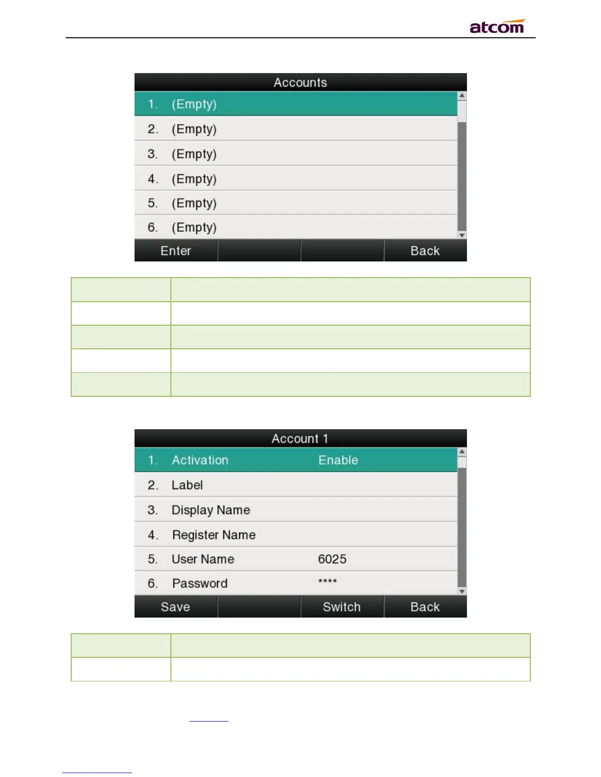 Select the account and press the soft keyEnter”to access the page of account setting.