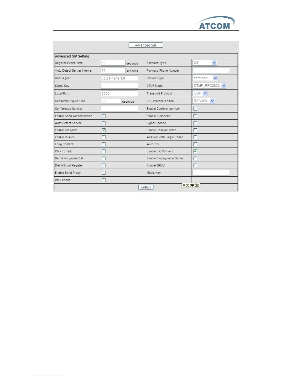 User Agent: Set the user agent if have, the default is VoIP Phone 1.0 .