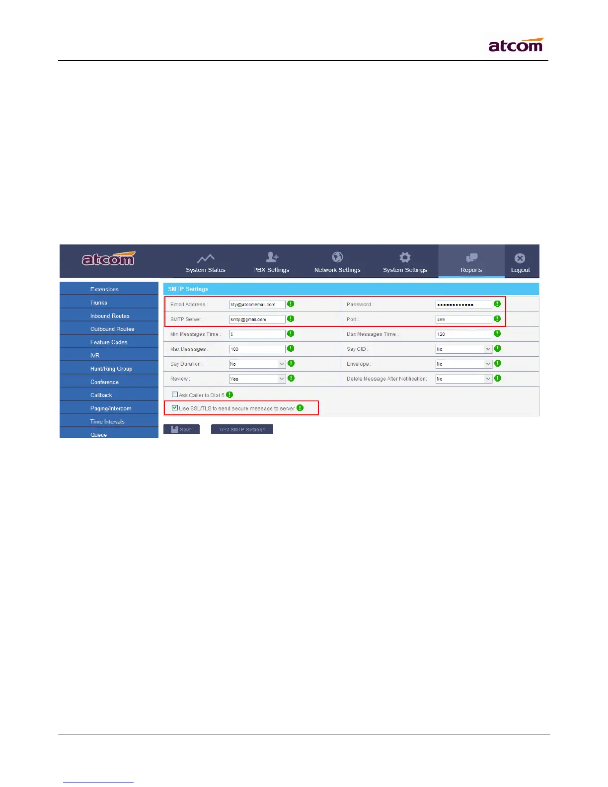 NOTE: After SMTP setting, please set Email address for each extension to achieve Voicemail to Email function.