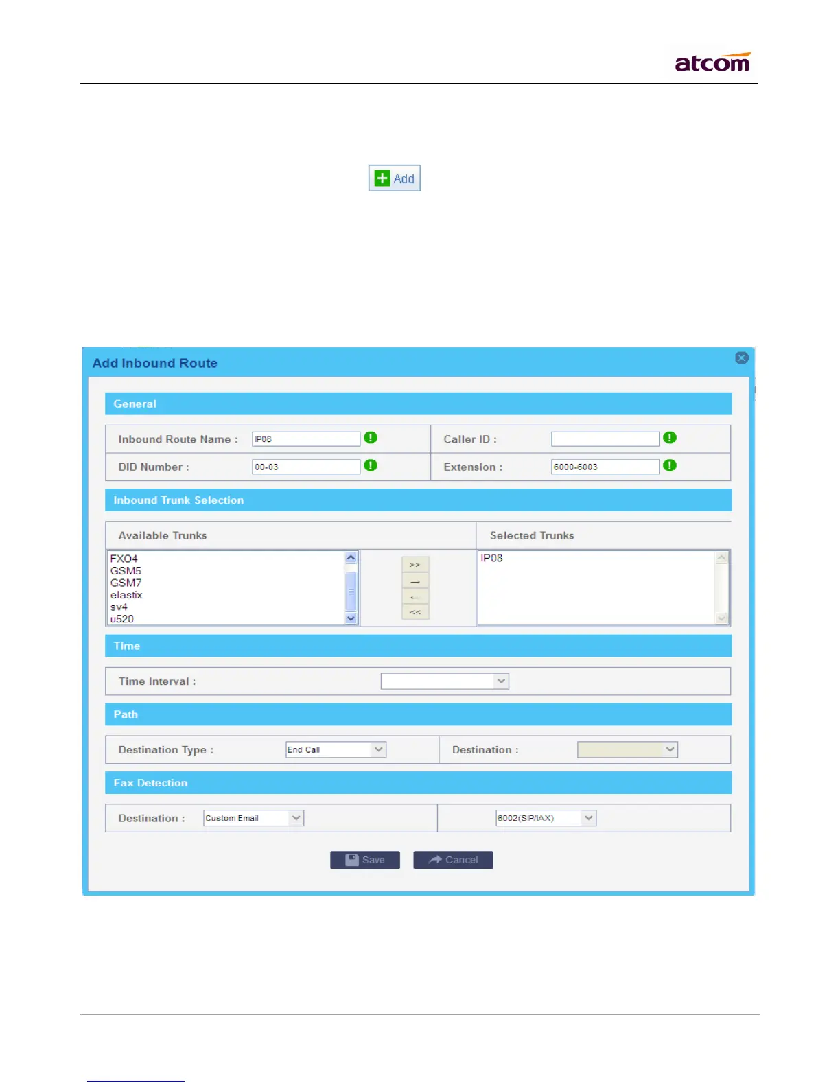 Go to PBX Settings -> Inbound Routes, click to add an inbound route.