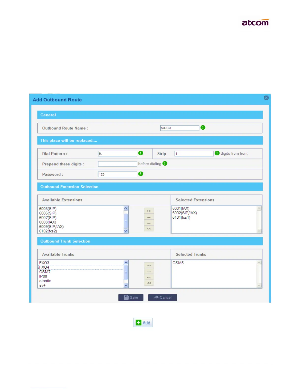 Select extensions which can dial out with this outbound route. In my case, only 6000,6001 can prefix 9 to dial out.