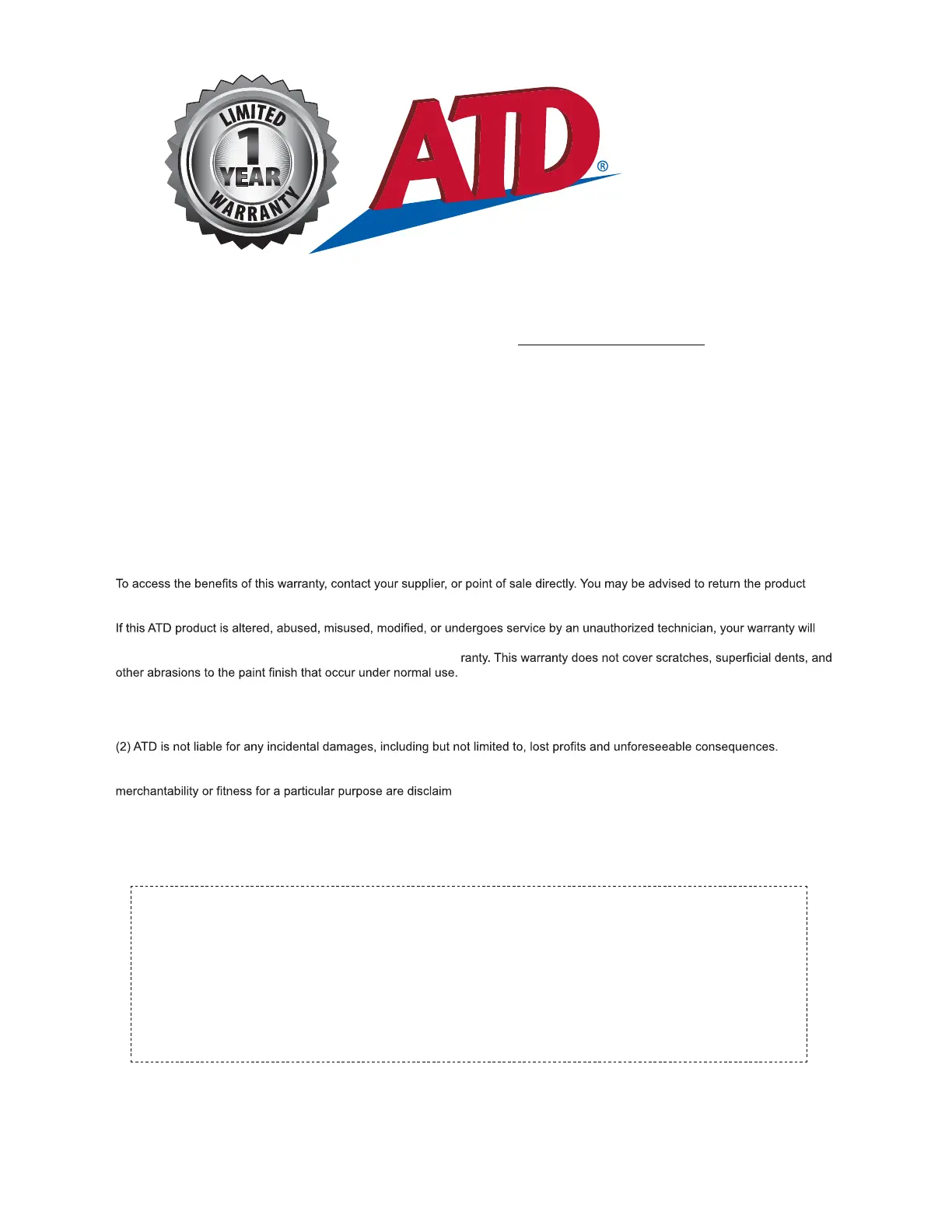 For a period of one (1) year from your purchase date, ATD Tools Inc. will repair or replace (at its option) without charge, your ATD