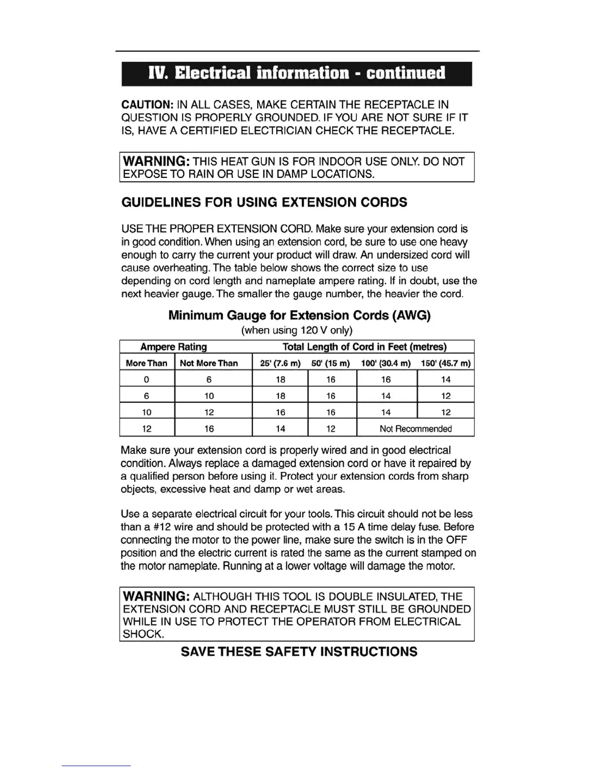 ATD Tools ATD-3736 - Electrical Information - Continued; Receptacle Grounding Verification; Extension Cord Guidelines; Circuit and Voltage Requirements