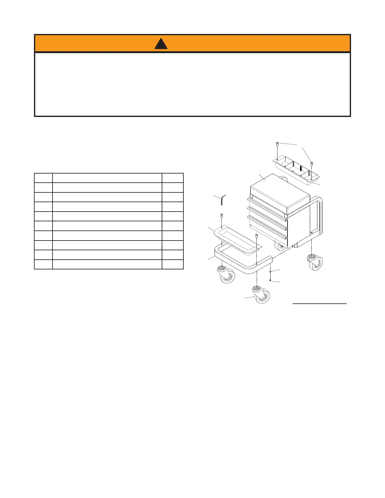 4. Ensure casters swivel and roll easily. Check Tool Box drawers for ease of movement.