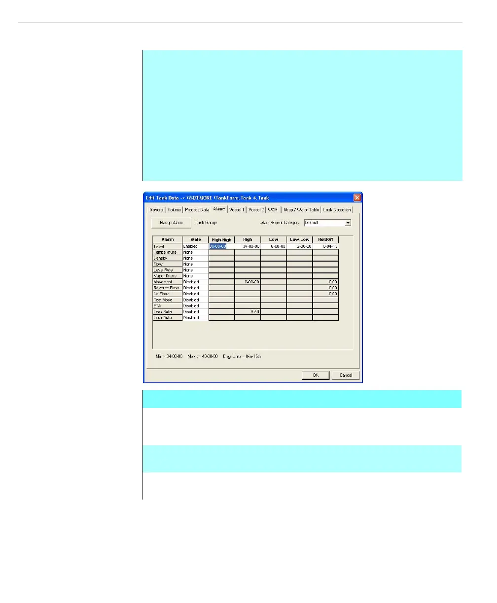 • In the Edit Tank Data dialog box, enter the required alarm setpoints for the