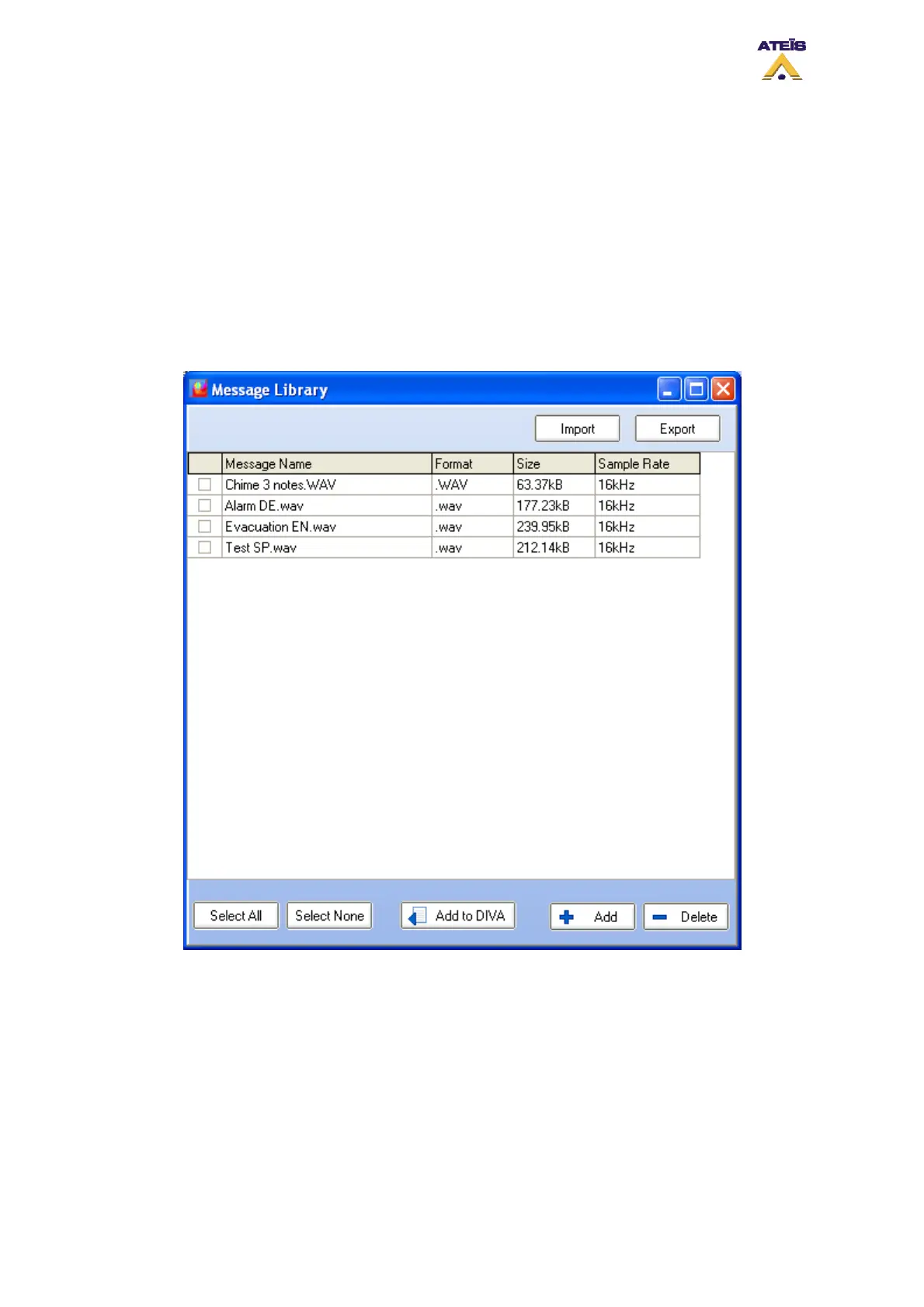 new window, see below. In this window you can select any wave file to be a message. Note: Only 16