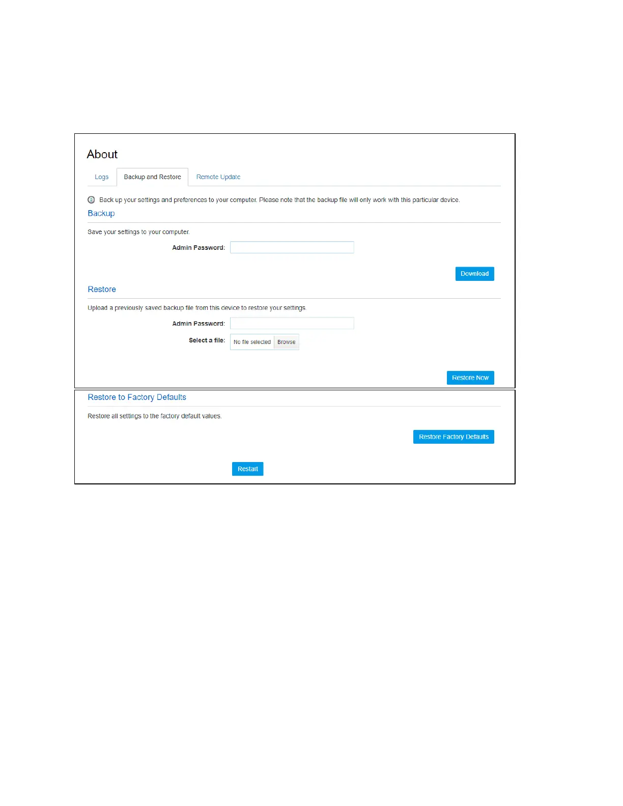 On this page, you can operate Backup, Restore, Restore to Factory Defaults and Restart.