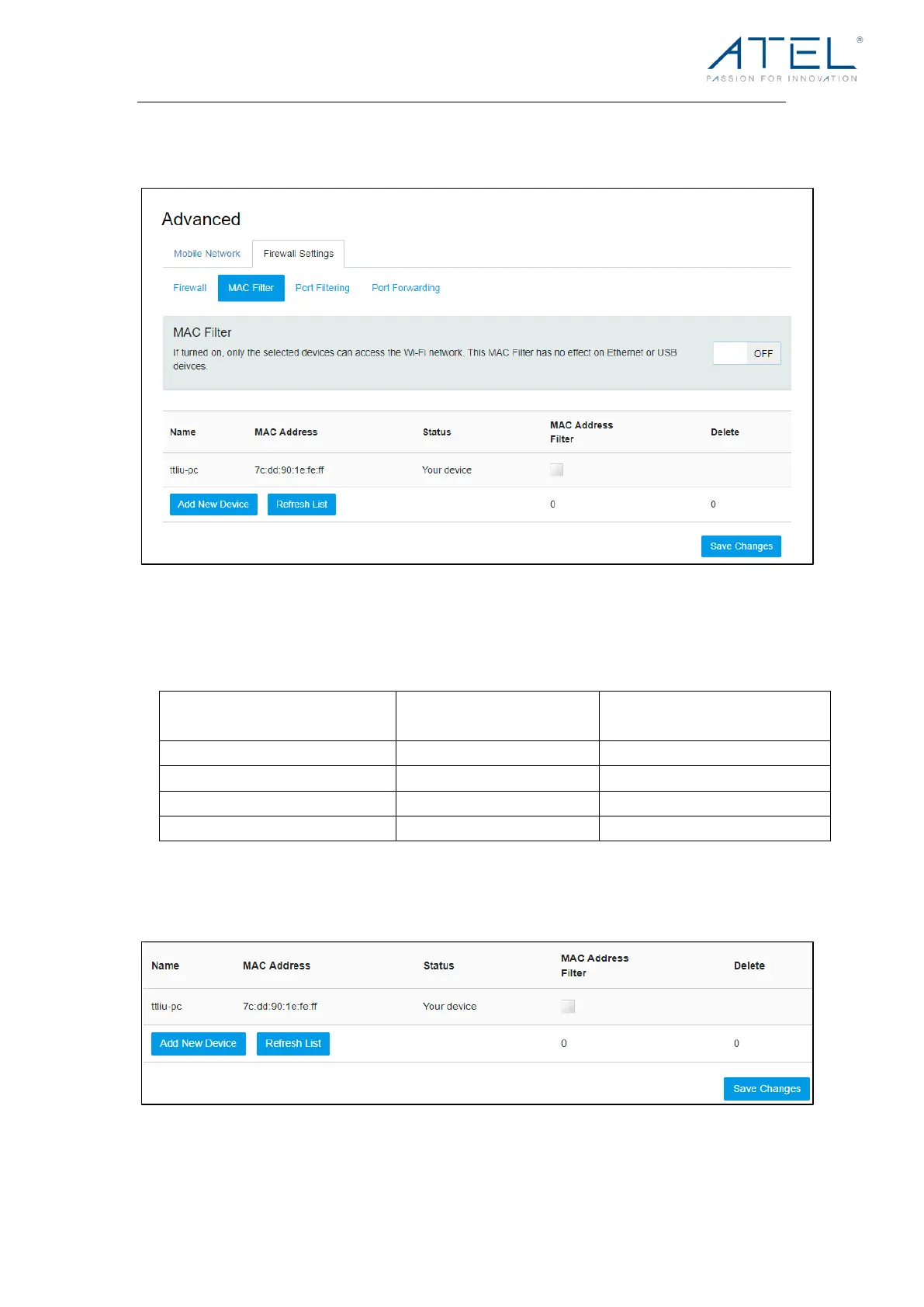 The default “MAC Filter” status is “OFF”. If the MAC Filter is on and devices are listed in