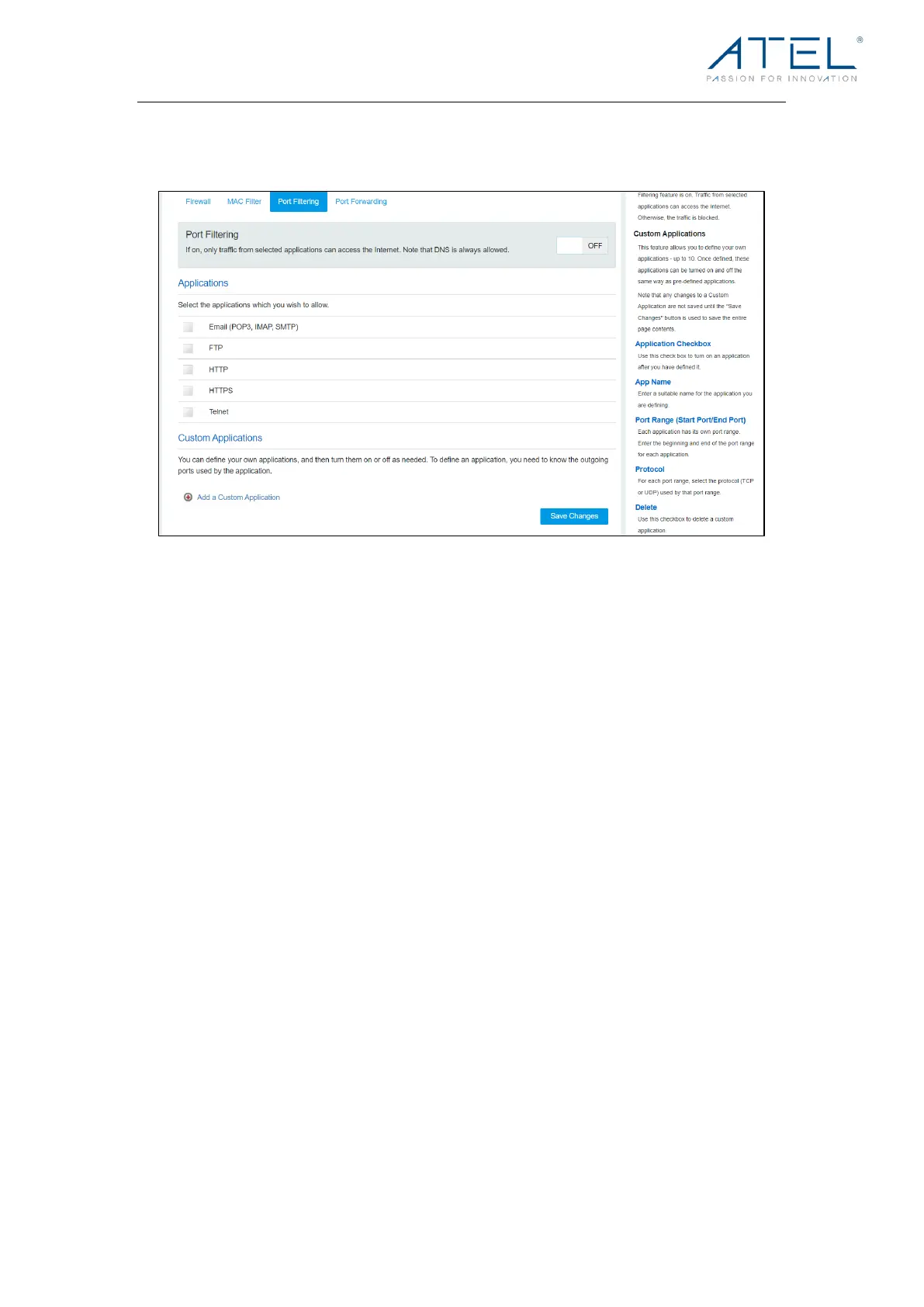 “Telnet”. If port filtering is on, only traffic from selected applications can access the Internet.