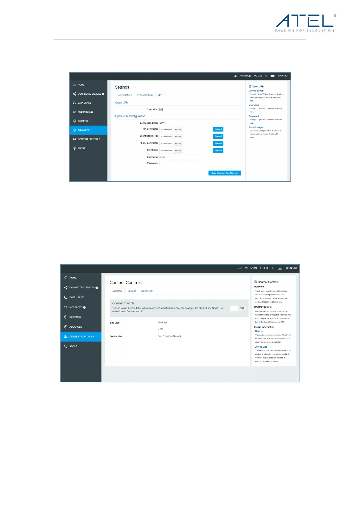 Atel V810A - VPN and Content Control; VPN Configuration; Content Control