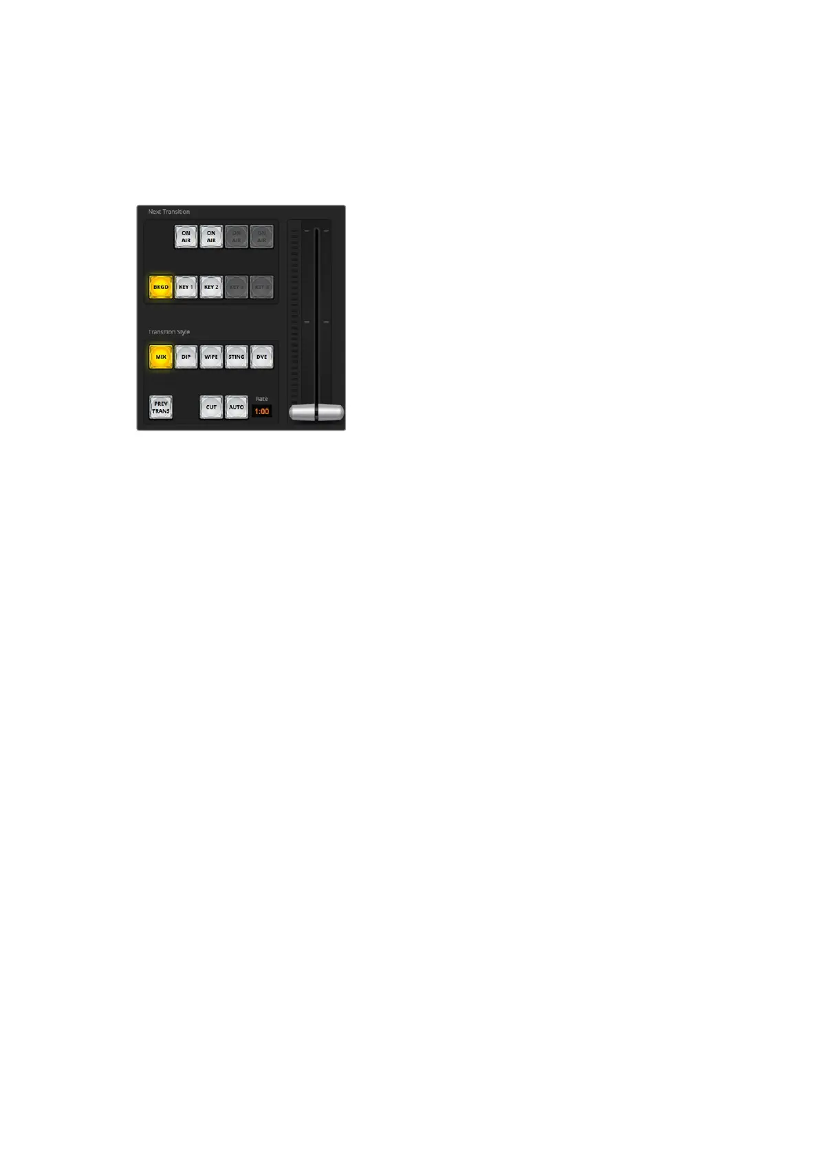 The transition style buttons allow the operator to select one of five types of transitions; mix, dip,