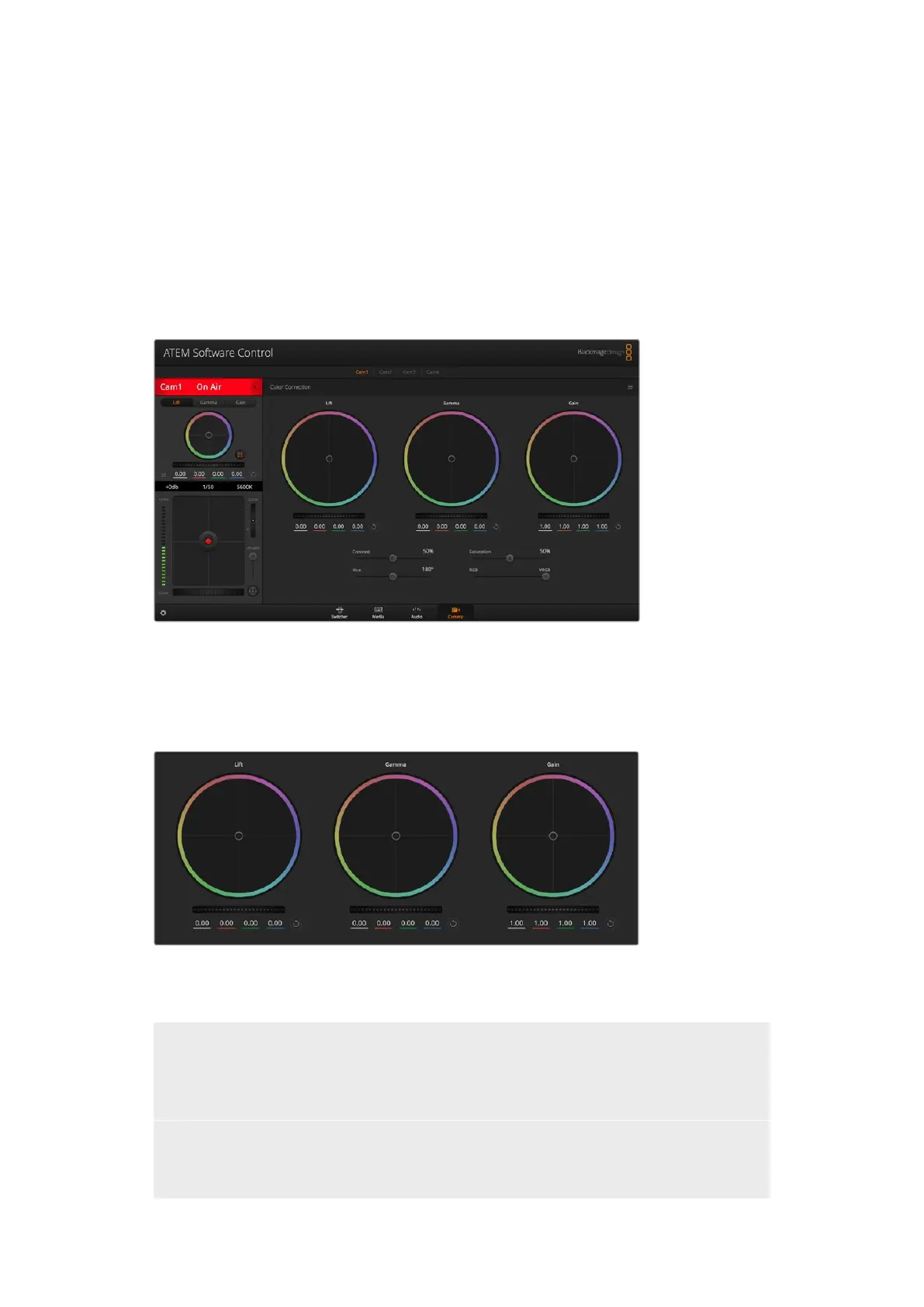 Lift, gamma and gain color wheels in the color corrector panel.