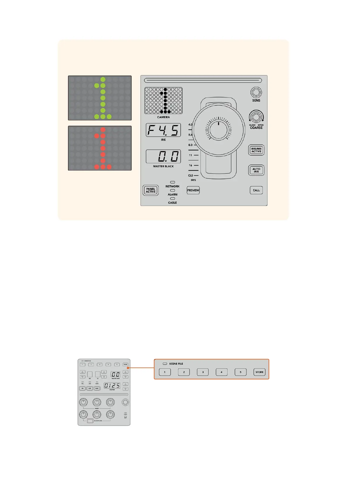 The scene file indicator and buttons will illuminate, indicating when a scene file is stored