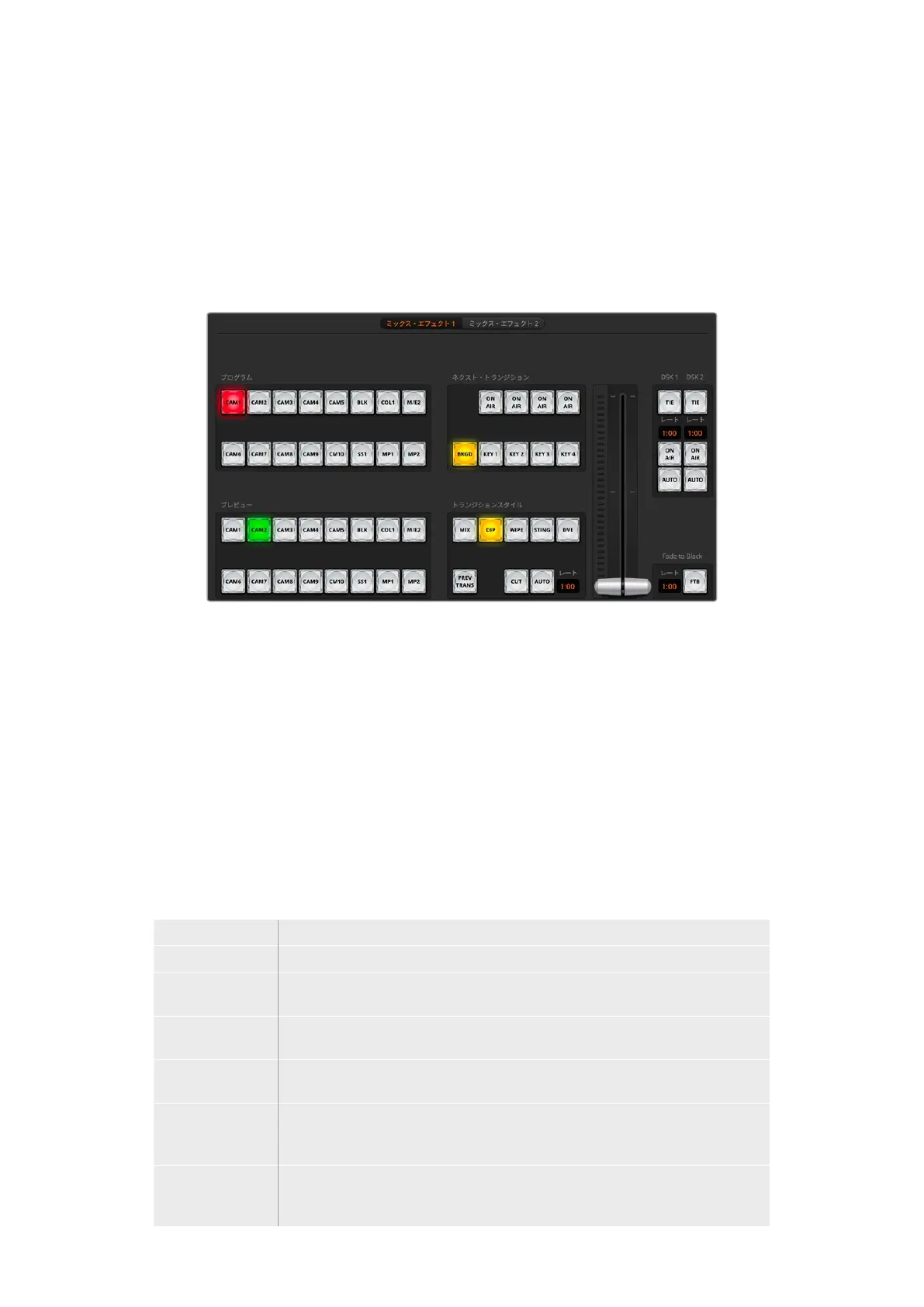 「スイッチャー」タブのミックスエフェクト・ブロックには、プログラムバ スおよびプレビューバスのすべ