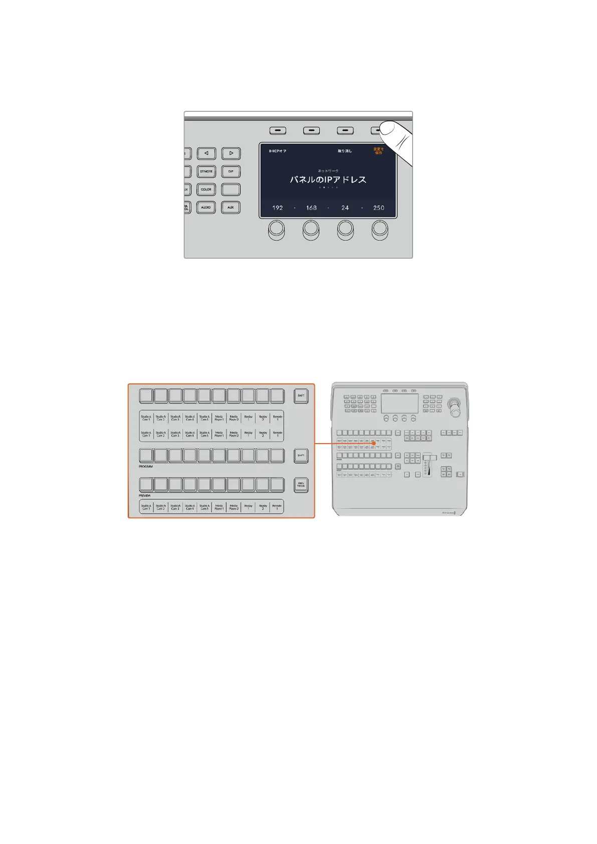 プログラムバス、プレビューバス、ソース名ディスプレイは、プログラム出力およびプレビュー出力のソー