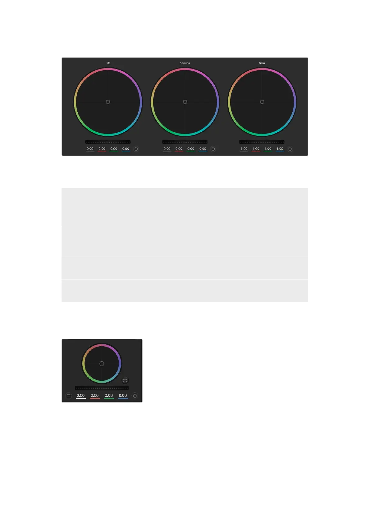 Lift, gamma and gain color wheels in the color corrector panel.