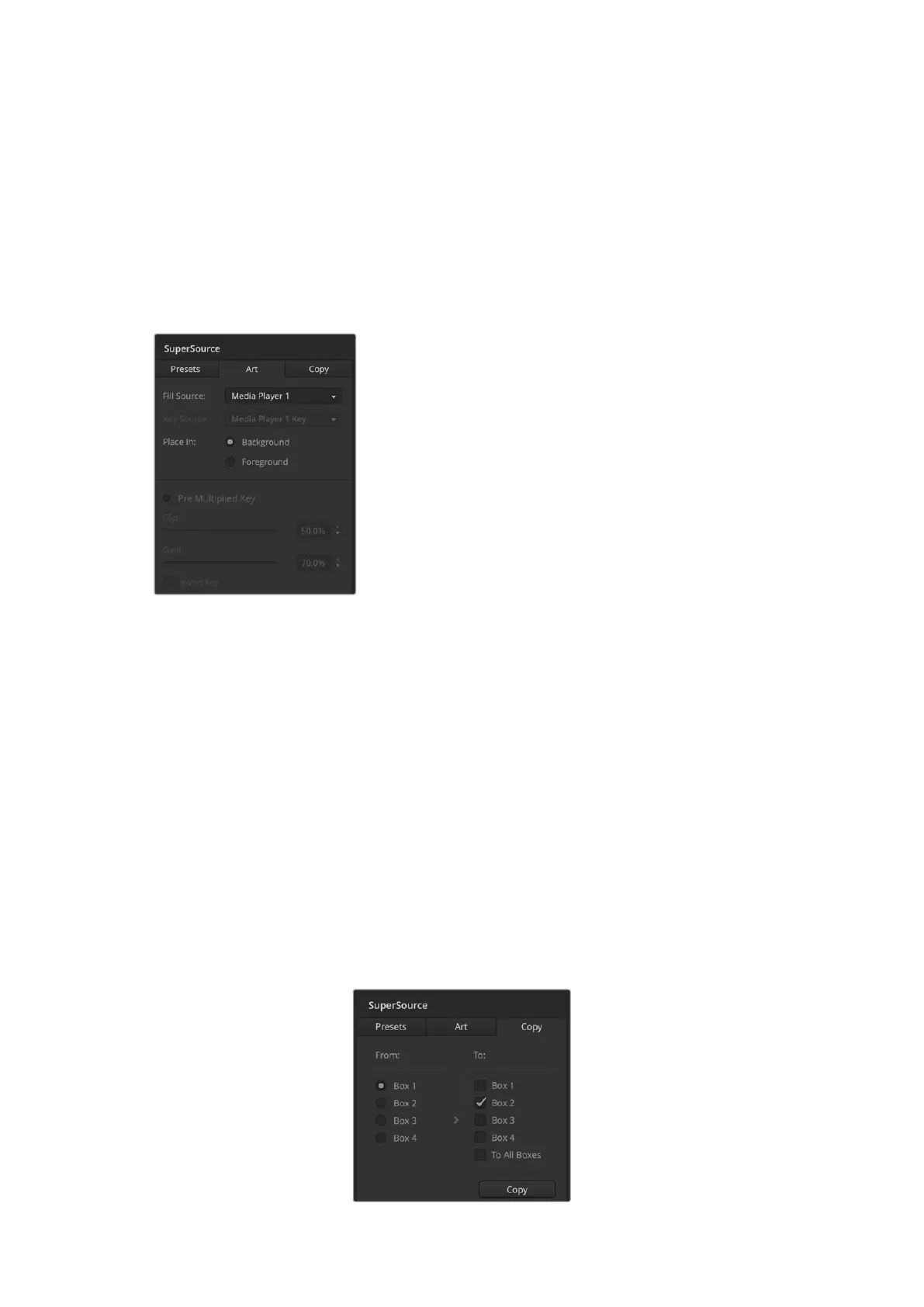 On the panel, in the SuperSource menu press the button marked art and then press the button