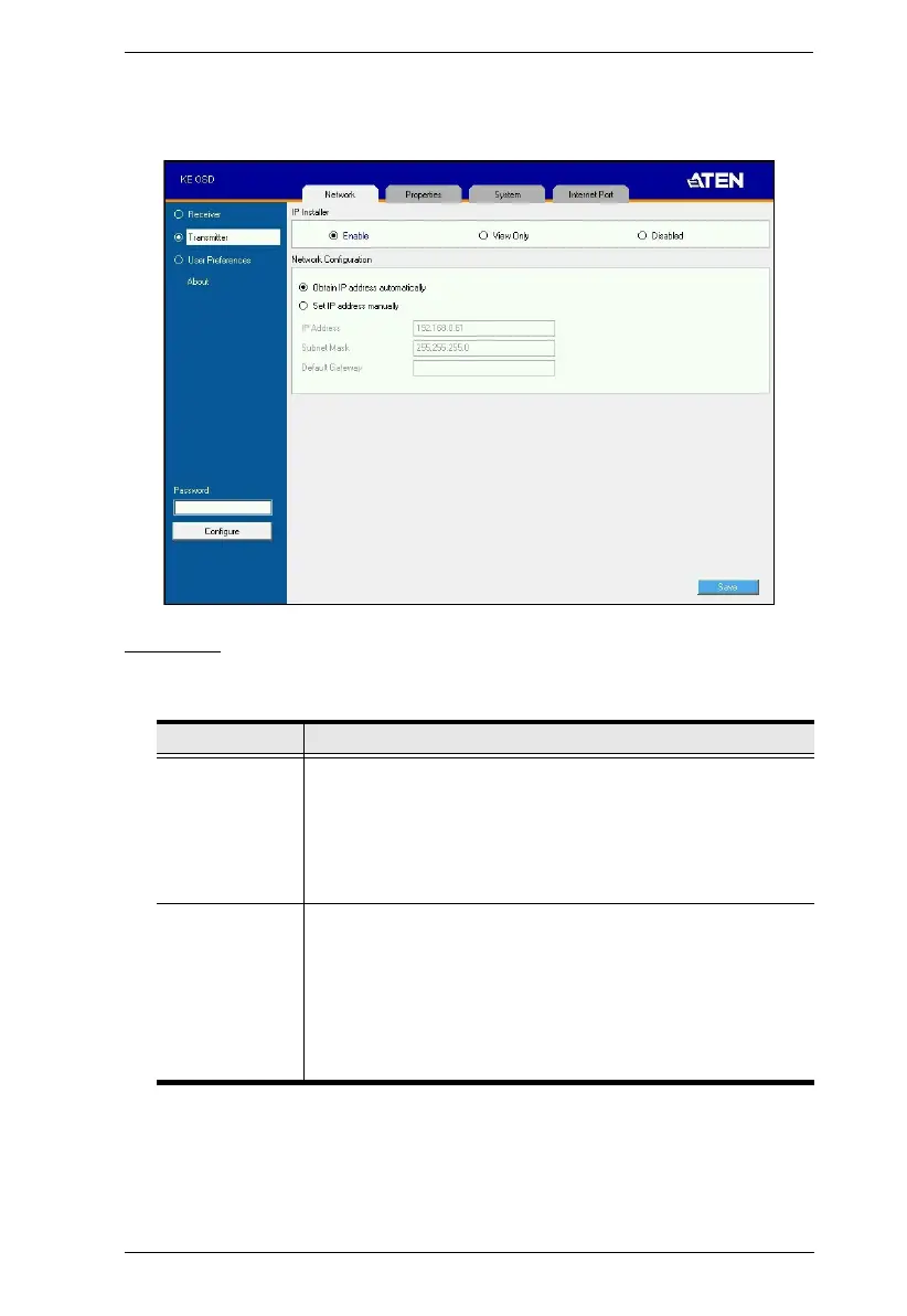 The Network tab allows you to configure the Transmitter’s IP address settings: