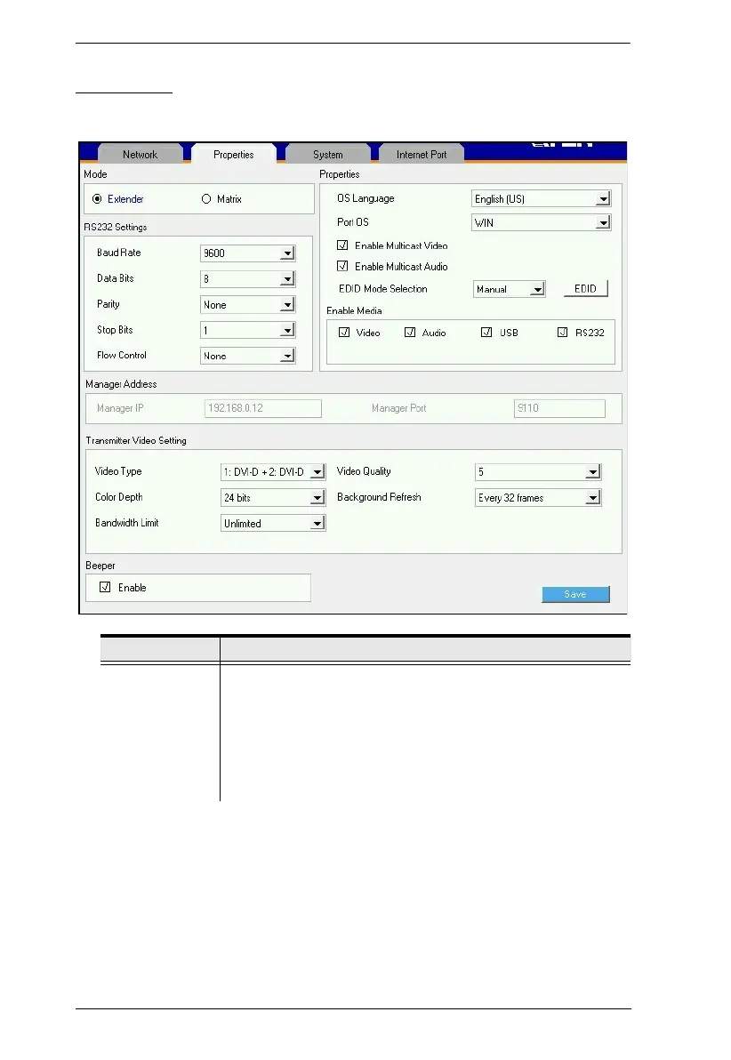 The Properties tab allows you to configure the Transmitter’s extender settings: