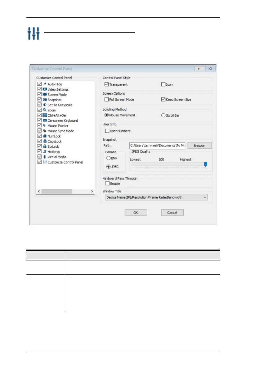 Clicking the Customize Control Panel icon brings up a dialog box that