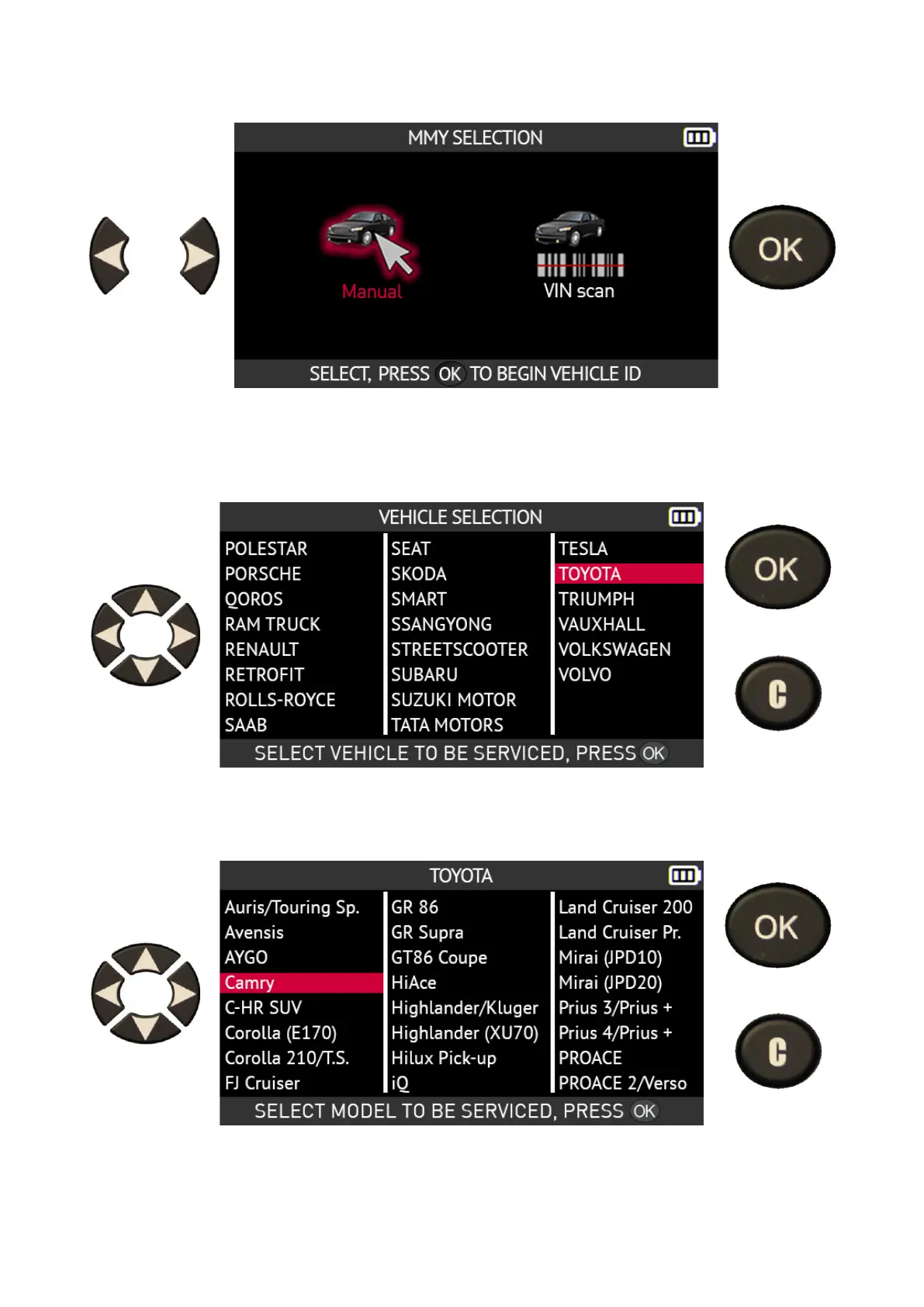 Use the arrow buttons to select the vehicle model. Press OK to confirm your choice.