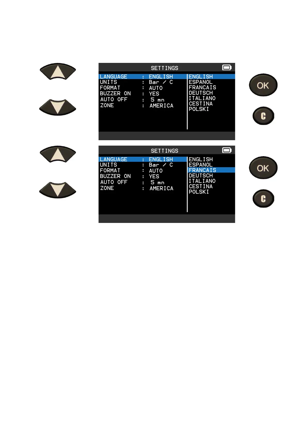 LANGUAGE: select displayed language among English, Español, French, Deutsch,